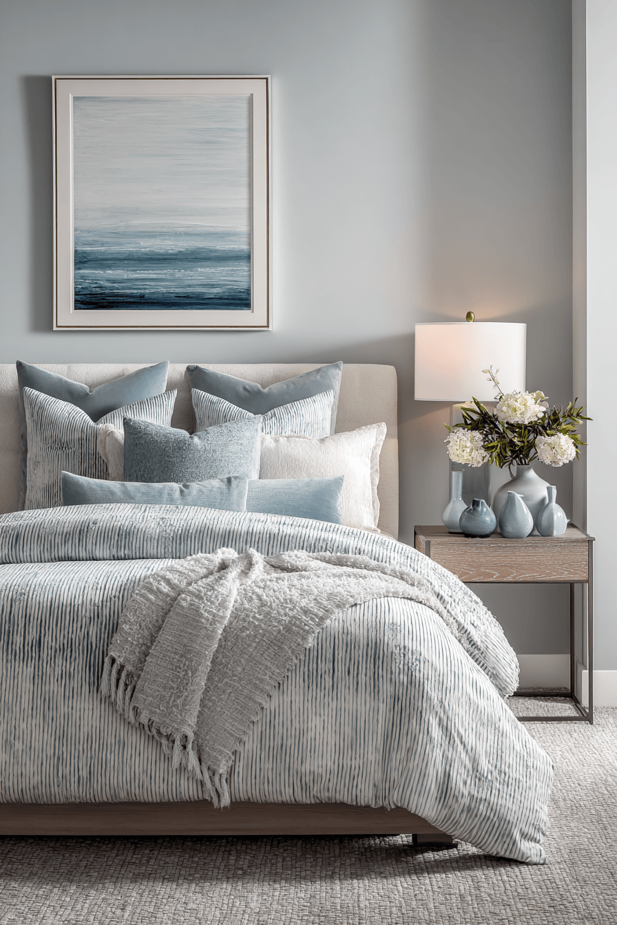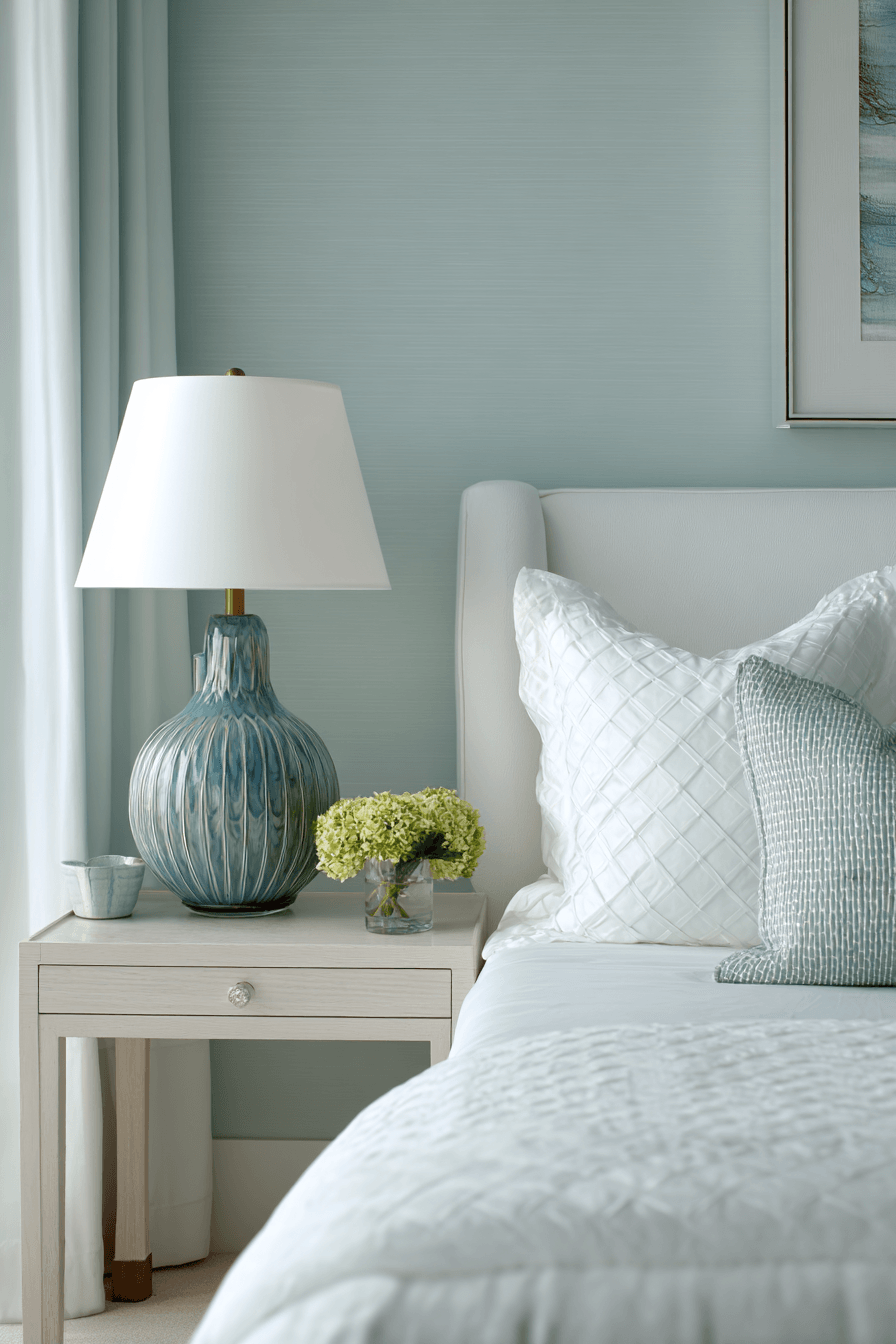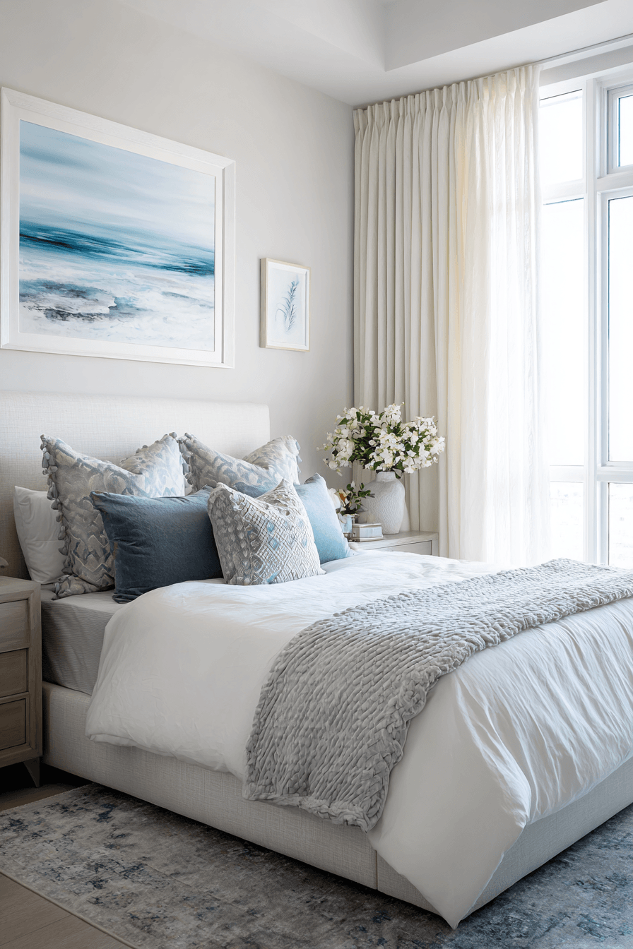 Cool ocean-inspired hues bring a refreshing energy to a coastal guest bedroom design. Smooth surfaces paired with soft textiles create a perfect blend of comfort and style. Hints of seafoam, sky blue, and misty gray add depth while keeping the palette soothing. The room feels instantly calming, helping guests relax as soon as they enter. Minimal decor ensures the space feels clean while still thoughtfully styled. Subtle lighting enhances the tranquil mood without overpowering the design. Click to discover more calming coastal interiors!