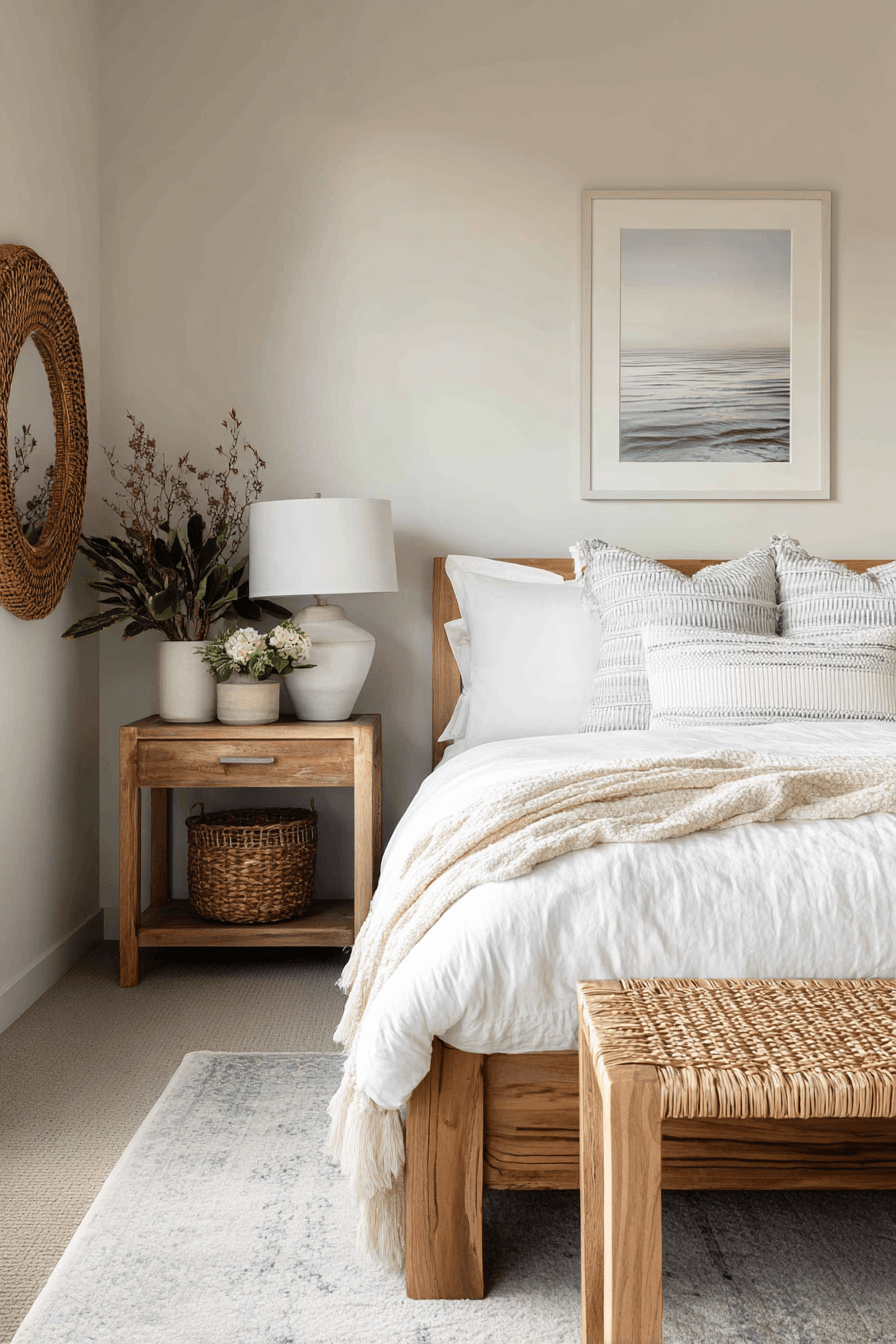 A coastal guest bedroom shines when natural materials and soft textures take center stage. Woven elements, light woods, and breathable fabrics create a layered, inviting look. Textured rugs, cane furniture, and linen bedding add richness without heaviness. The room feels balanced with just the right amount of decor to keep it visually interesting. Soft lighting and neutral tones enhance the relaxing ambiance. Every detail works together to create a comfortable and stylish retreat. Explore more beautifully layered coastal bedroom ideas!