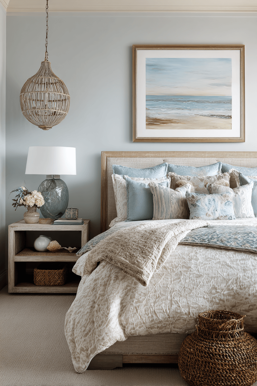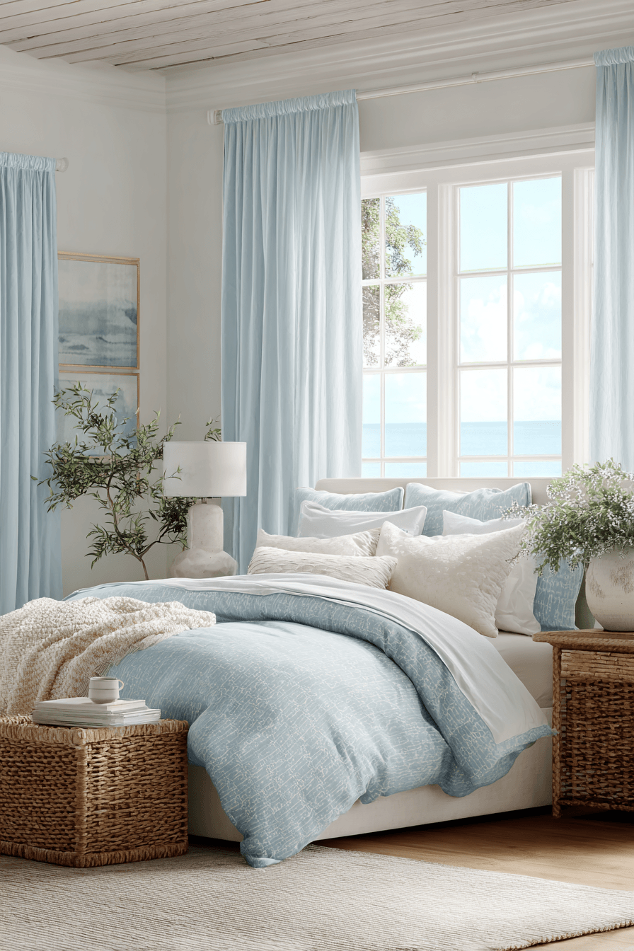 A coastal guest bedroom thrives on soft, dreamy tones that echo the sea and sky. Gentle layering of plush bedding, breezy curtains, and light textures creates a welcoming and luxurious feel. Pale blue duvets, cloud-like pillows, and gauzy window treatments enhance the soft aesthetic. The palette stays cohesive with whites and sandy neutrals blending seamlessly together. Natural materials like rattan nightstands and driftwood frames bring warmth while keeping the design fresh. The result is a space that feels peaceful, stylish, and thoughtfully curated. Explore more dreamy coastal bedroom styles today!