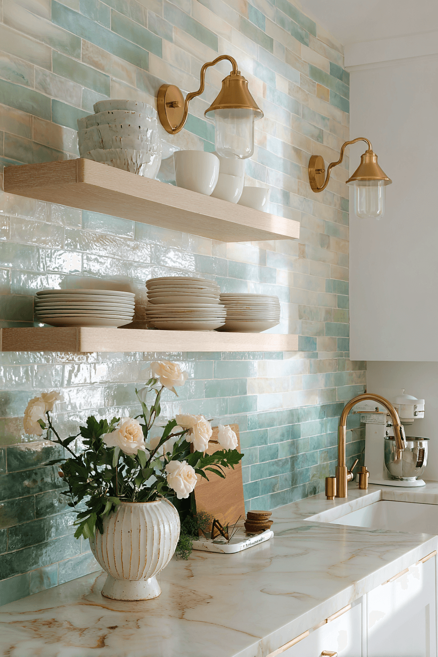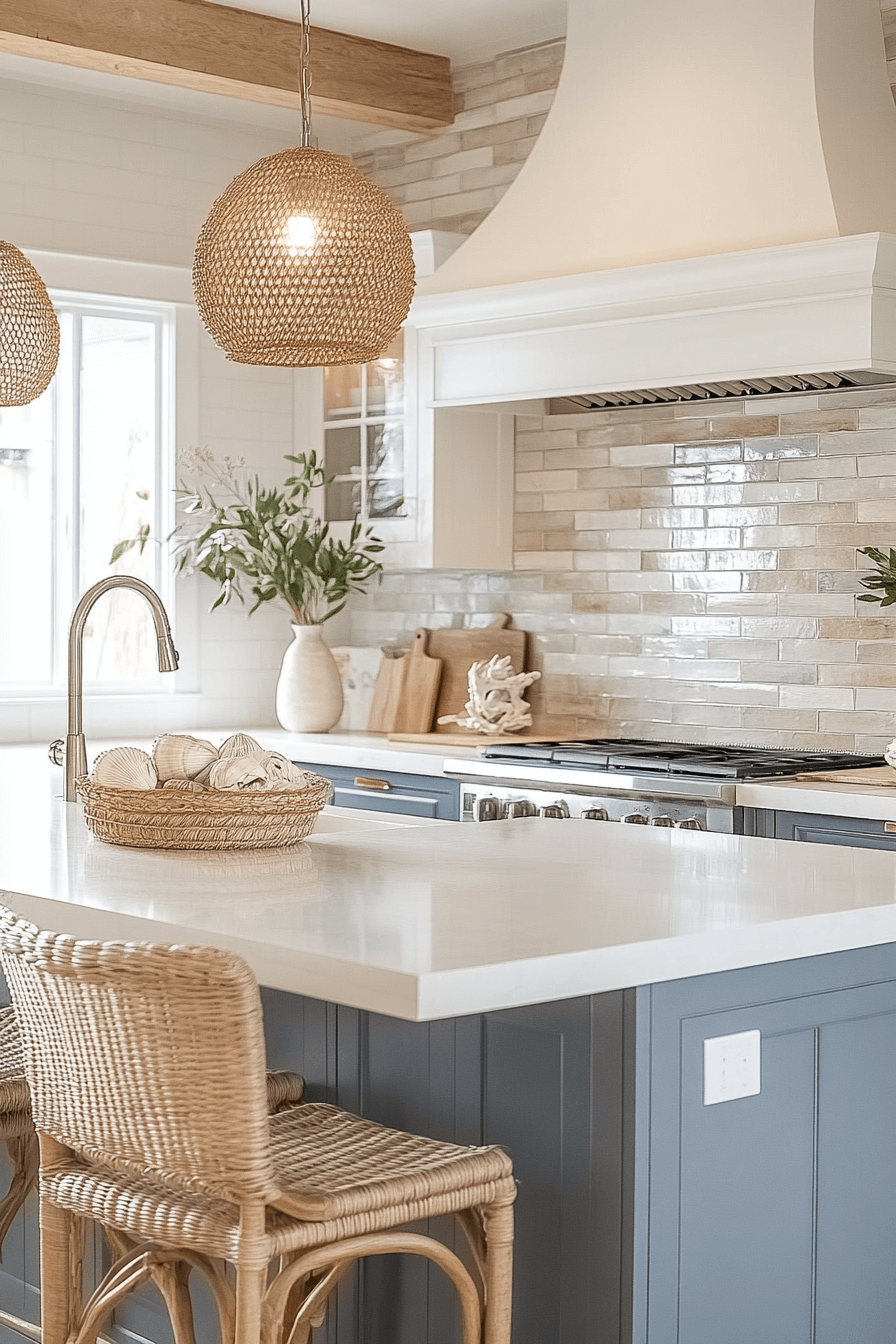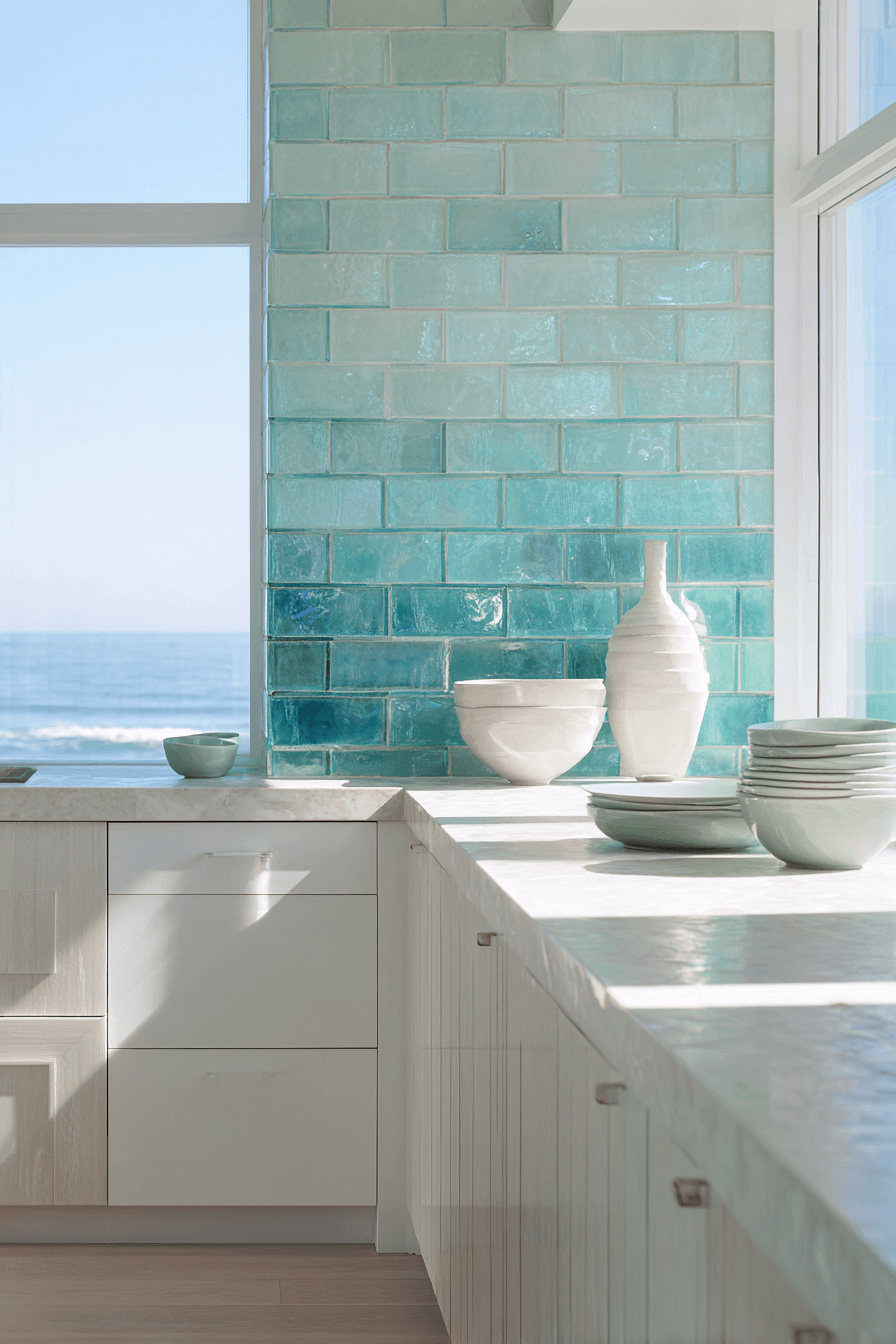 A hint of seafoam green in your tile selection brings soft ocean energy into your space, making it a standout among coastal kitchen backsplash ideas. This calming hue lifts the overall mood, blending beautifully with light woods and white stone surfaces. The gentle shine on the tiles catches the light, giving your kitchen a refreshing and open feel. It’s the perfect way to introduce subtle color while keeping the look breezy and relaxed. Think gentle waves meeting sandy shores right at your countertop. Tap here to explore more dreamy coastal kitchen backsplash ideas that soothe the senses!