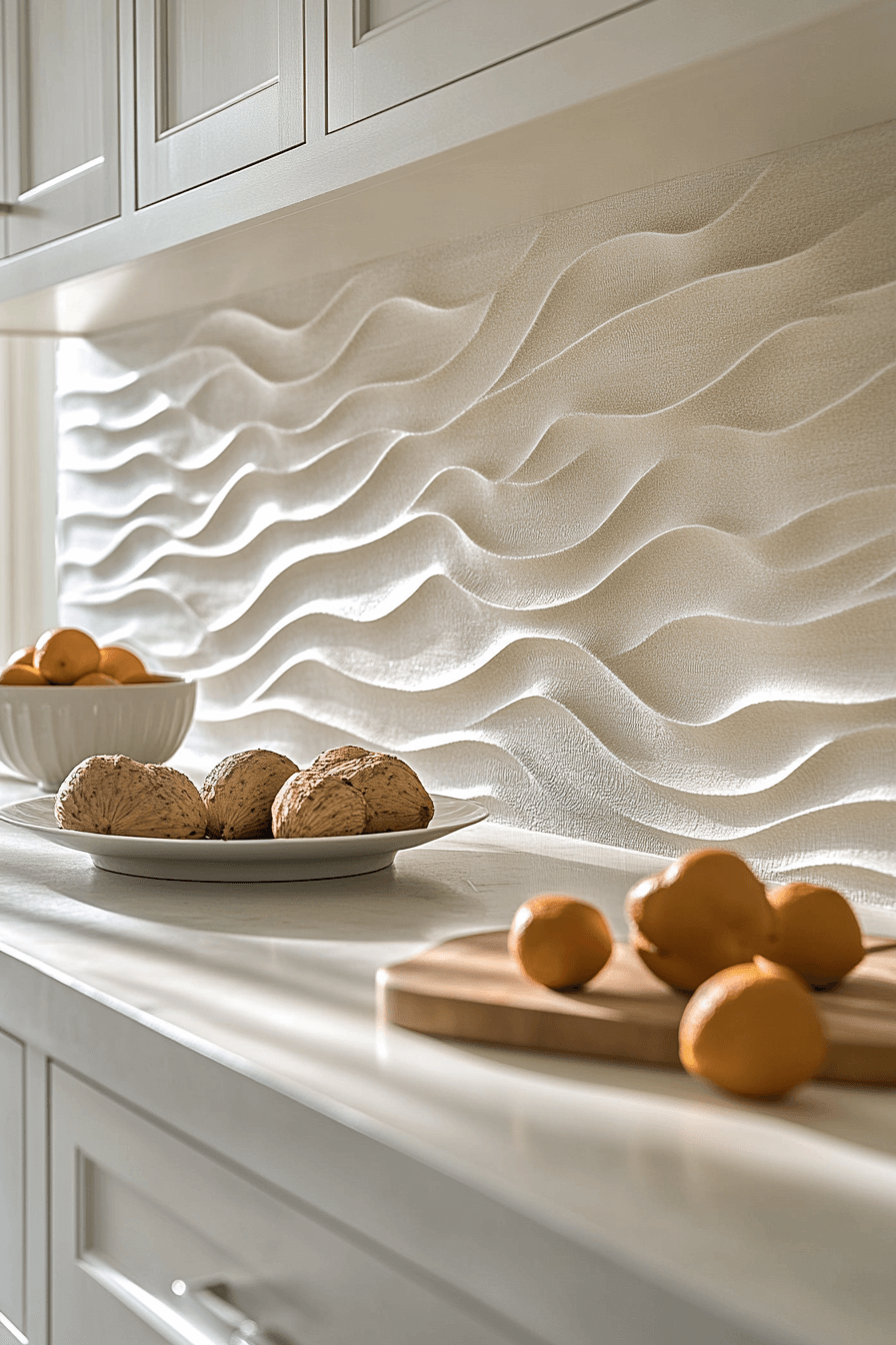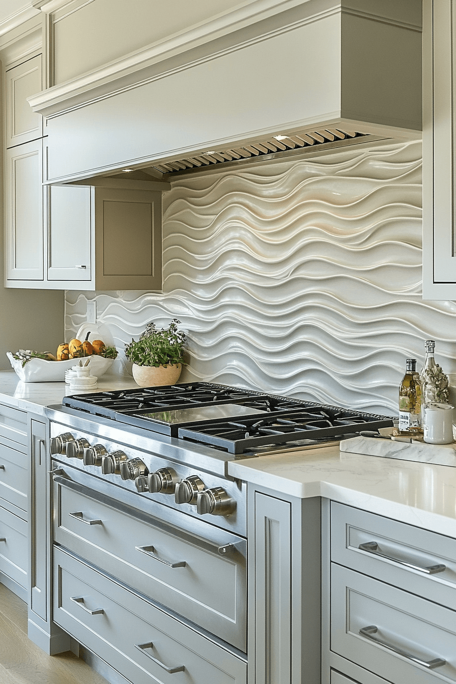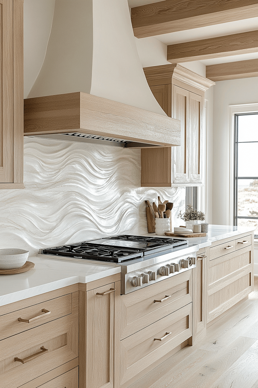 Wavy tile designs bring the rhythm of the sea to your backsplash in a subtle, sculptural way. Choose soft coastal tones like misty gray or aqua green to reinforce the look. These textured tiles add motion without feeling too literal, fitting beautifully into coastal kitchen backsplash ideas that prioritize calm elegance. Their tactile nature draws the eye and adds dimension to flat walls. Ideal for behind the stove or across an entire wall. Tap here to discover wave-patterned backsplash styles with coastal flow!
