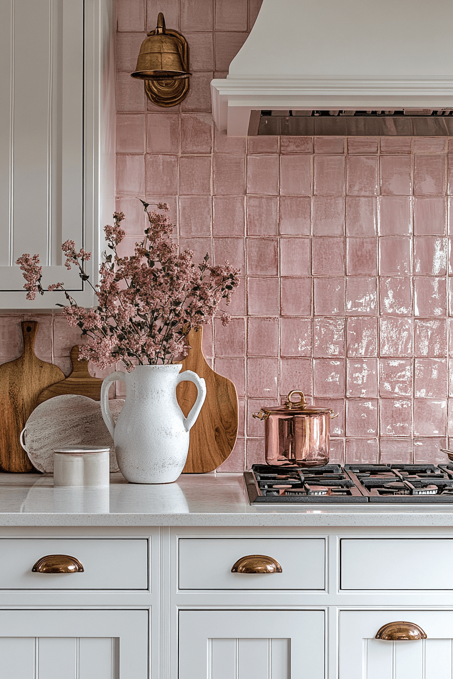 Drawing from beach sunsets, blush tile backsplashes offer a gentle infusion of warmth and romance. This palette creates a soft glow that looks stunning in kitchens with natural light. It’s an unexpected yet charming direction for coastal kitchen backsplash ideas. These tiles pair well with light woods, white cabinets, or sky blue accents. The effect is breezy, lighthearted, and beautiful. Click here for more sunset-inspired coastal backsplash concepts!