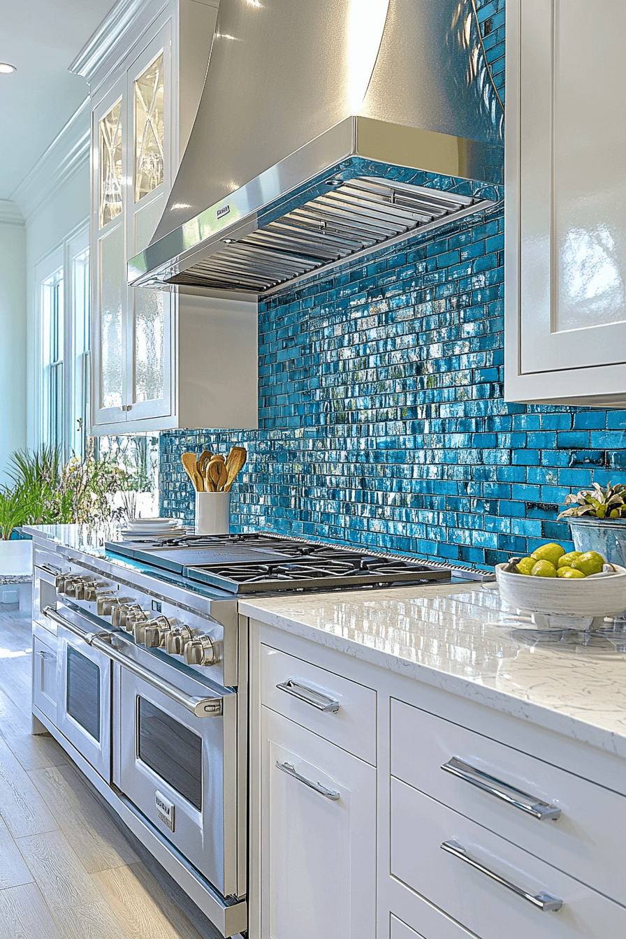 Polished ocean-blue tiles bring richness and reflectivity to the kitchen, delivering depth while staying true to coastal style. Their glossy finish bounces light throughout the space, making even small kitchens feel expansive. This bold choice stands out among coastal kitchen backsplash ideas for its moody yet refreshing vibe. Paired with crisp whites or light woods, the result is striking and upscale. The deep sea tone adds drama without overpowering the calm aesthetic. Tap here to dive into bold backsplash looks that echo the ocean’s depth!