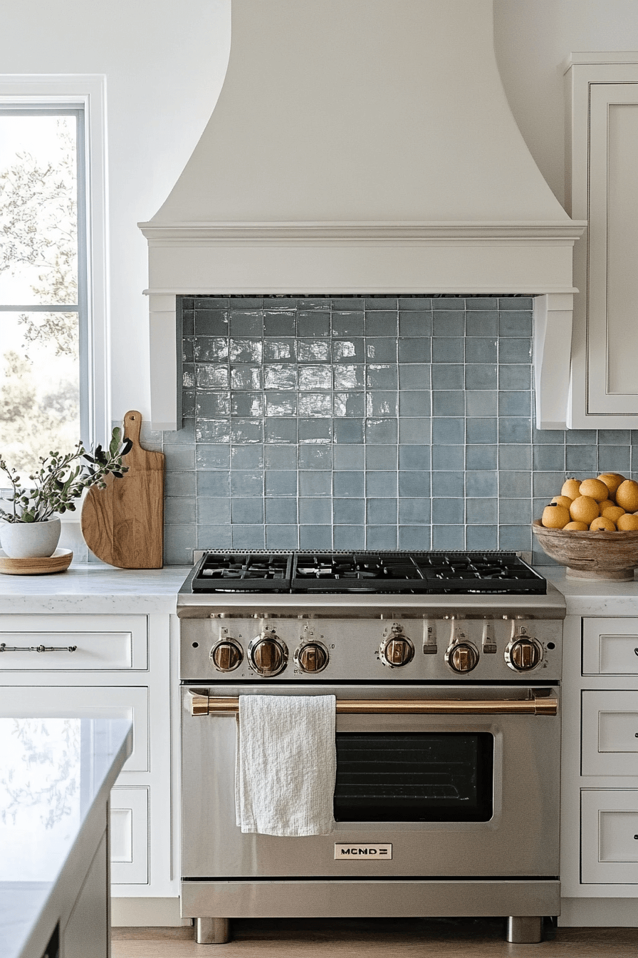 Soft, misty gray or pale blue tiles create a gentle coastal fog effect that feels clean and modern. These tones offer just enough color to evoke the sea without overwhelming minimalist designs. Among coastal kitchen backsplash ideas, this one is perfect for Scandinavian-inspired interiors. It brings a calming atmosphere and allows bolder elements to shine around it. The whisper of color is subtle but stylish. Click now to explore backsplash options with that quiet, fog-kissed charm!