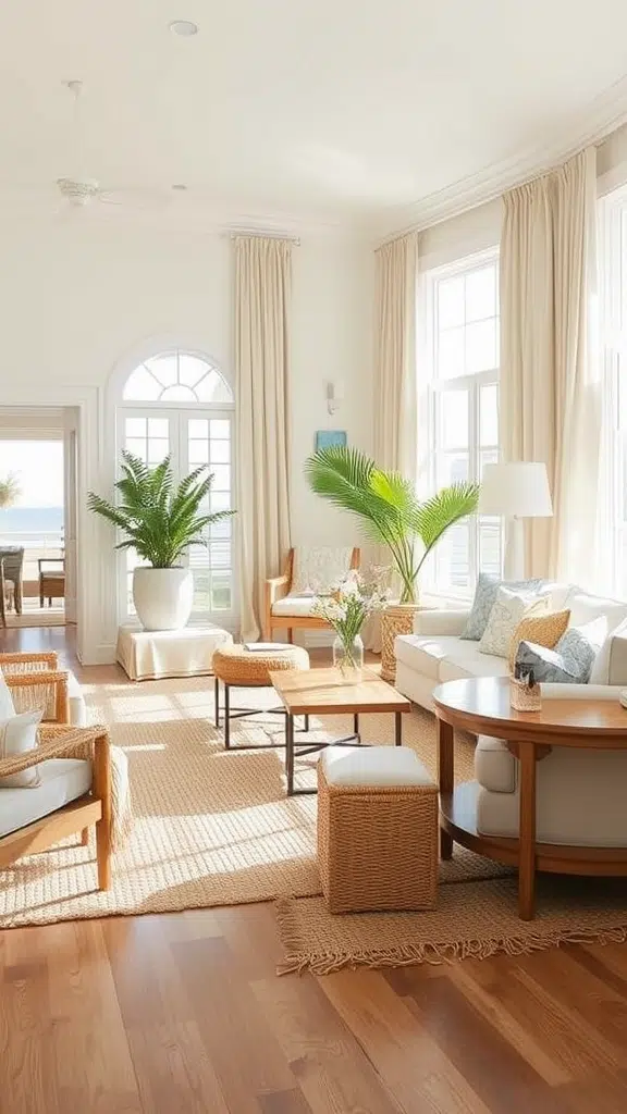 Oversized natural fiber rugs instantly ground a space with their earthy texture and understated charm, creating a cohesive foundation for coastal home decor. With their warm beige or sandy tones, sisal and jute rugs evoke the calming essence of nature while blending seamlessly with beachy furniture and airy accessories.