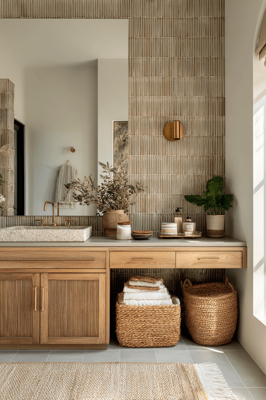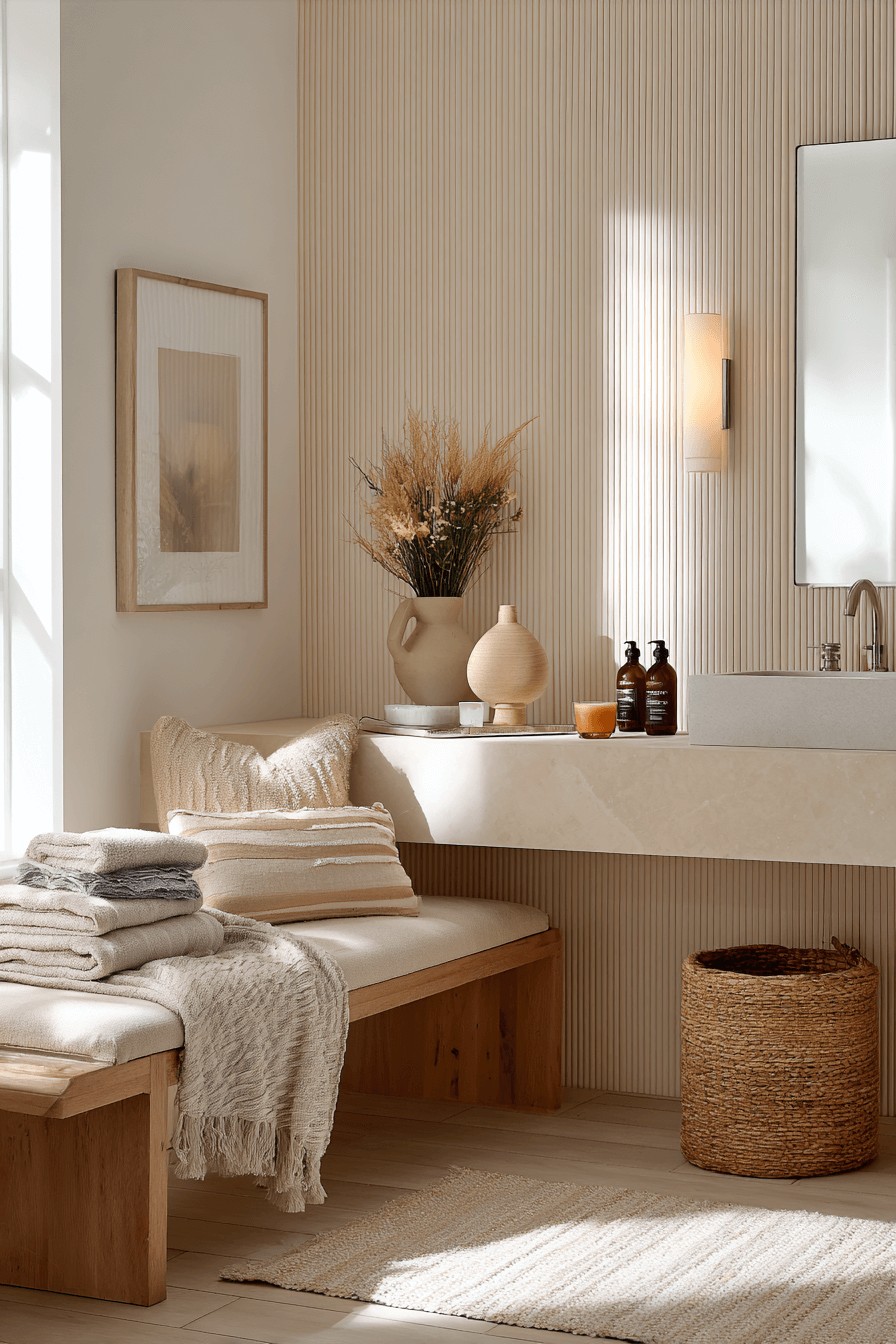 Texture is the secret ingredient to a truly cozy bathroom that feels layered and lived-in. Think ribbed tiles, woven baskets, plush rugs, and soft linens working together. These tactile details break up hard surfaces and add instant warmth. Even a simple vanity feels elevated when surrounded by texture. The design works because it appeals to both the eye and the touch. Tap for more texture-rich bathroom ideas.
