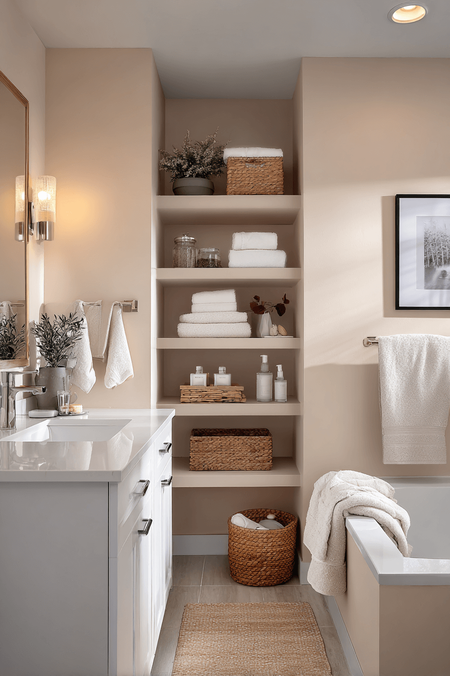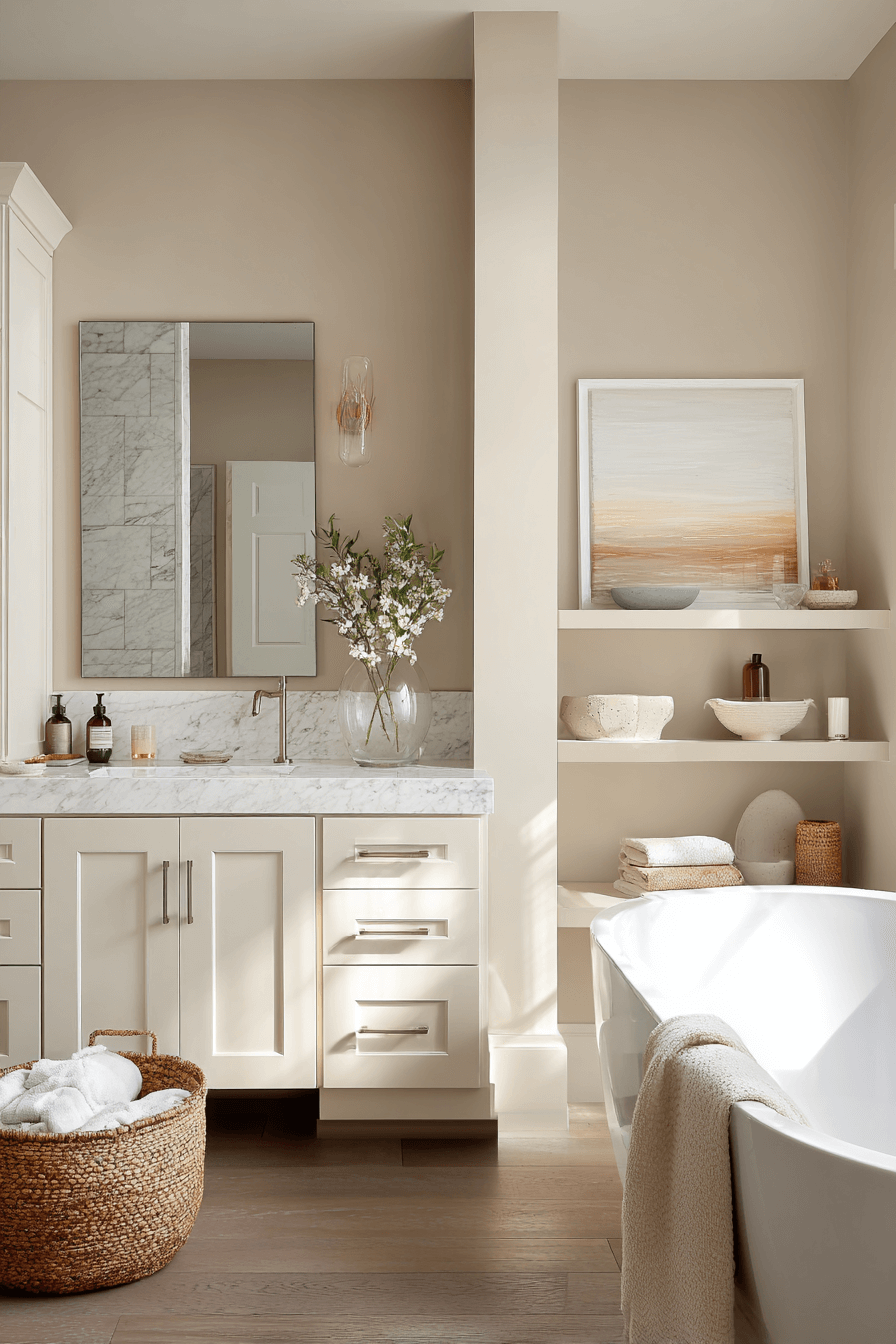 A warm neutral haven is the kind of cozy bathroom that instantly makes you exhale the moment you walk in. Think creamy beiges, soft taupes, and gentle ivory tones layered together to create a soothing, wrapped-in-comfort atmosphere. When you mix plush towels, matte fixtures, and subtle lighting, the space feels calm but still modern and elevated. Natural textures like stone, wood, or woven accents help soften the clean lines and add depth without clutter. This style works beautifully because it feels timeless, effortless, and endlessly inviting. If you love bathrooms that feel like a daily retreat, click to explore more inspiration.