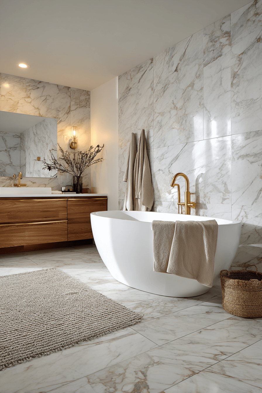 Marble doesn’t have to feel cold when styled thoughtfully in a cozy bathroom. Pair warm-toned marble with soft textiles and ambient lighting to create balance. Wood vanities or brass hardware keep the stone from feeling sterile. The mix of luxury and comfort feels elevated yet welcoming. This design works because it blends refinement with softness. Click to explore more modern marble looks.