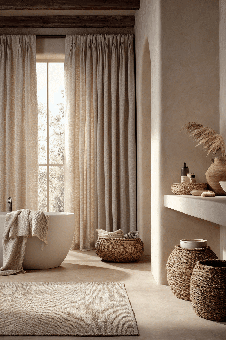 Layered linen luxury is all about turning your cozy bathroom into a soft, touchable haven. Linen curtains, waffle towels, and plush bath mats create depth and warmth. Natural tones keep the look cohesive and serene. When everything feels soft, the space instantly becomes more inviting. This approach works because comfort is both visual and tactile. Tap to add this softness to your space.