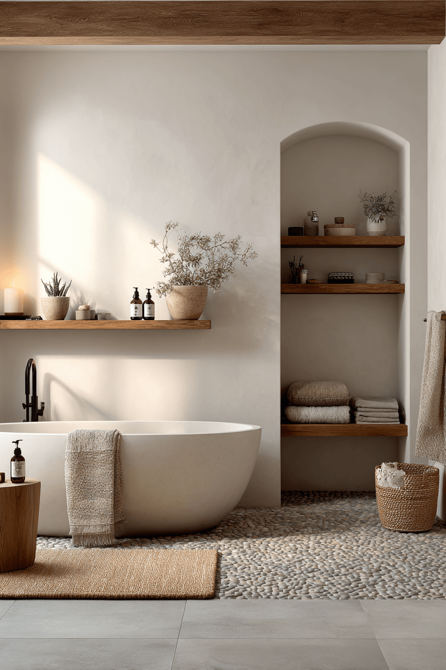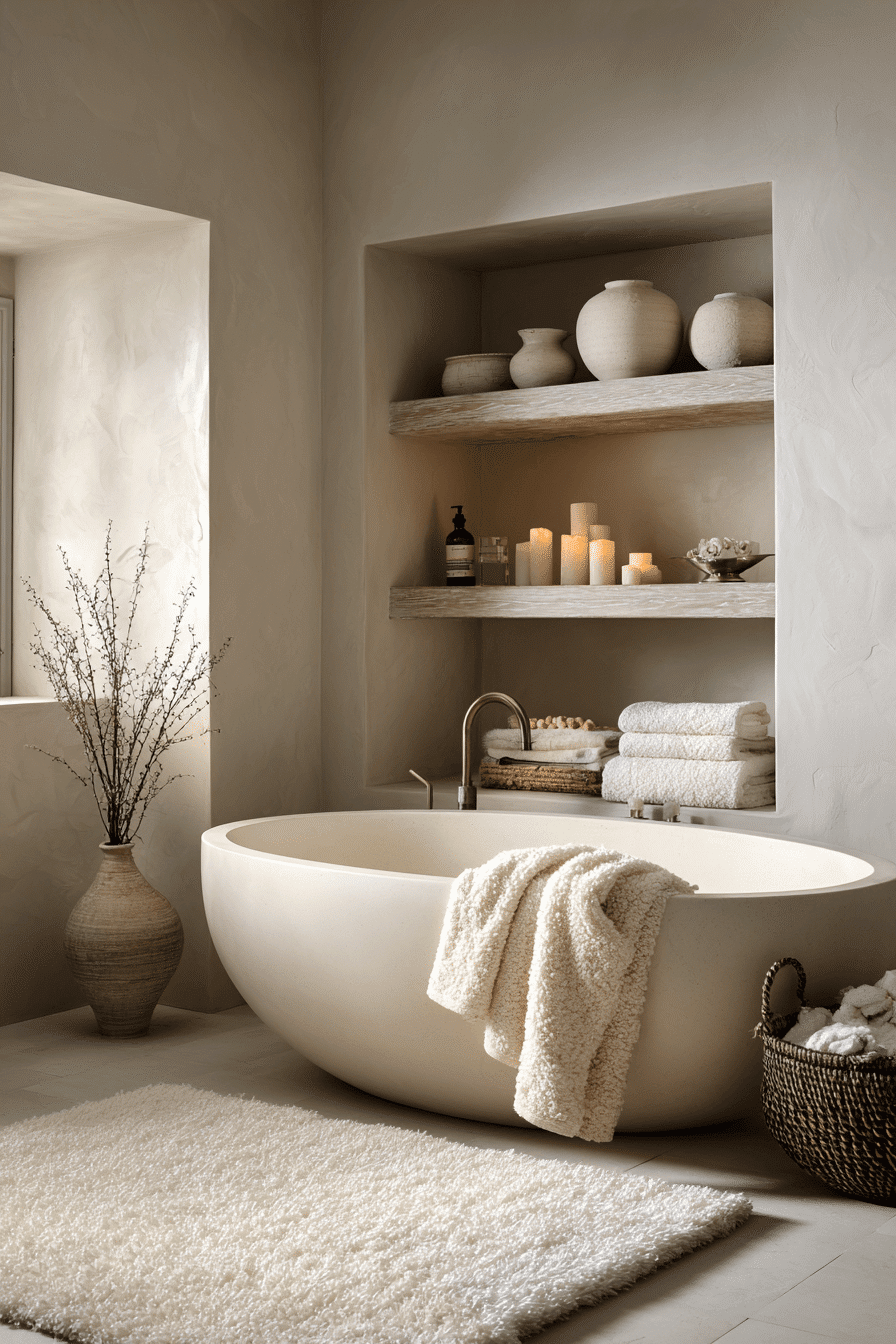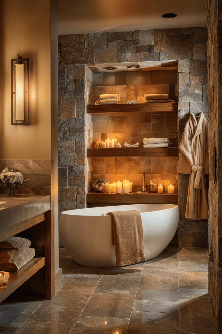 A serene spa cocoon surrounds you with calming tones and soft textures that define cozy bathroom living. Neutral palettes layered with warm lighting create depth and peace. Natural materials like wood and stone enhance the grounding effect. Plush towels and simple decor keep it uncluttered yet inviting. This works because it prioritizes relaxation in every detail. Click for more spa-like ideas.