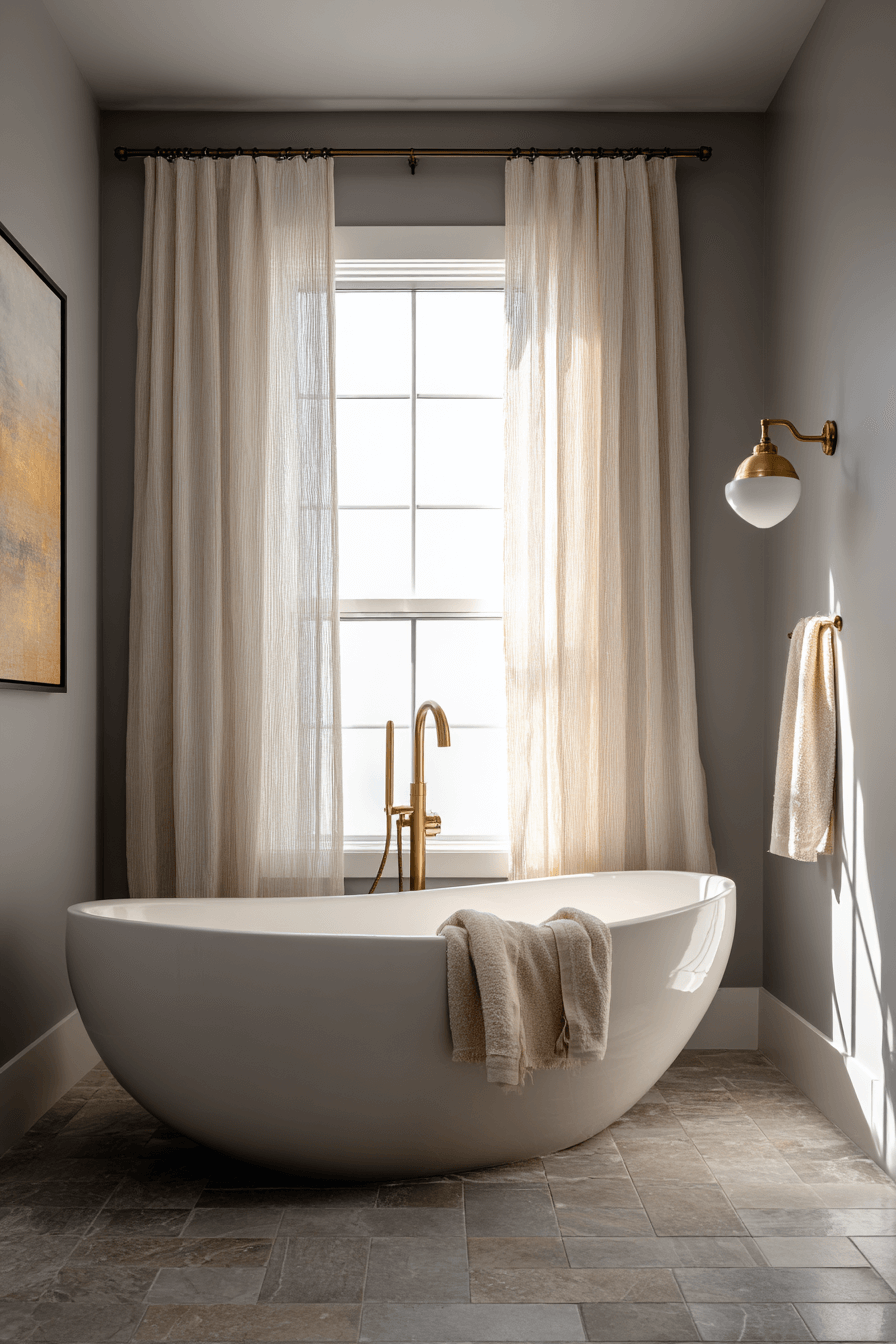 Soft grey tones can absolutely anchor a cozy bathroom when balanced with warmth. Choose warm greys rather than cool tones to avoid a sterile feel. Add creamy textiles and wood accents to soften the look. Layered lighting keeps the palette from feeling flat. This design works because grey provides calm without overpowering the space. Tap to see more serene grey ideas.