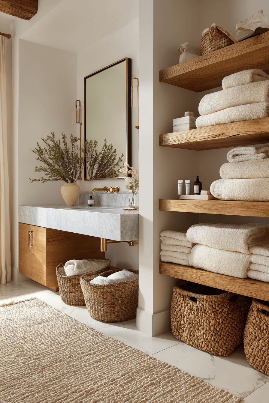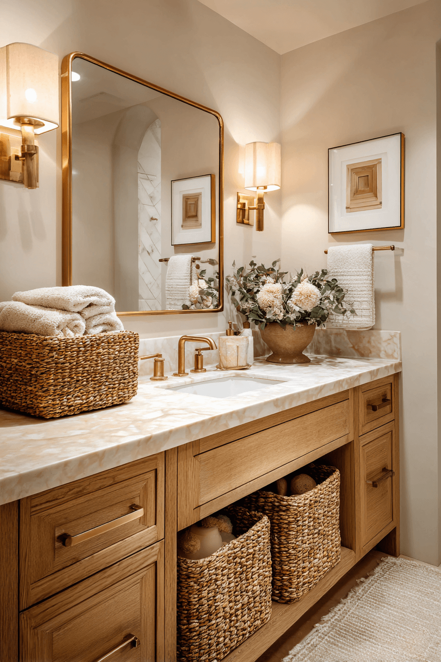 Honey-toned finishes bring subtle golden warmth into a cozy bathroom. Whether through wood cabinetry or brass accents, the effect feels glowing and inviting. Paired with creamy walls and soft lighting, the space feels enveloping. Texture adds depth and prevents it from feeling overly polished. This look works because warmth naturally draws people in. Click to explore more golden-inspired bathrooms.