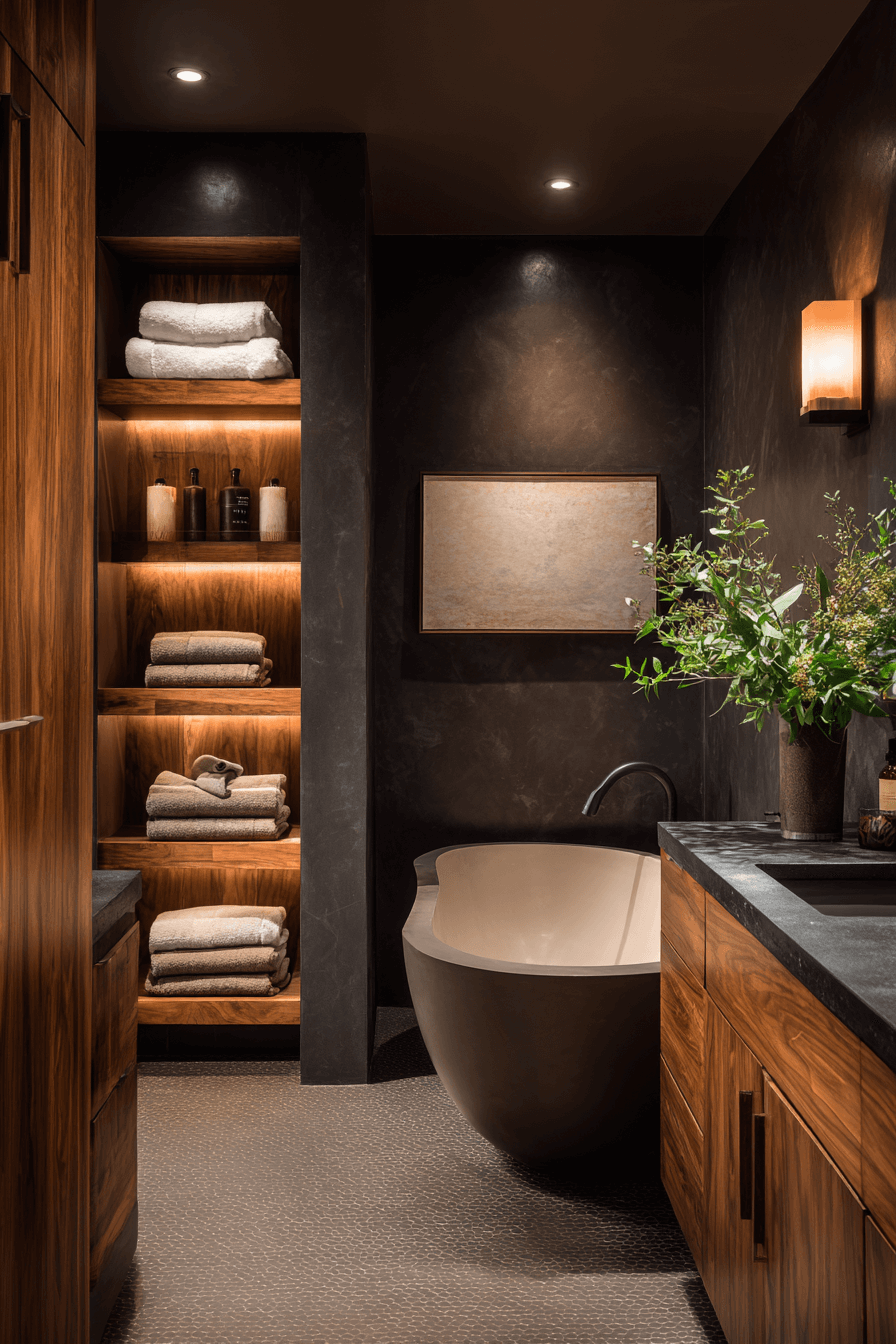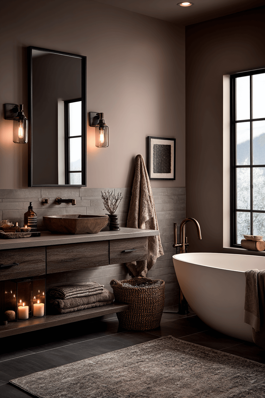 A moody warm escape is perfect if you want your cozy bathroom to feel dramatic yet comforting at the same time. Deep earthy tones like warm charcoal, cocoa brown, or muted olive create a cocooning effect that feels luxurious and safe. When balanced with warm lighting and textured finishes, the darker palette feels rich instead of heavy. Adding layered textiles and wood accents keeps the space grounded and welcoming. This style works because it embraces depth and intimacy, making even larger bathrooms feel personal. Tap to see how to pull off this stunning look.