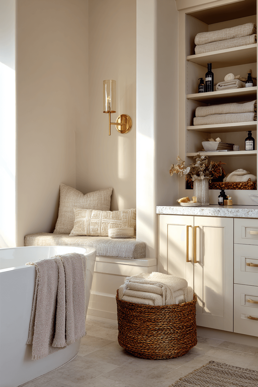 A quiet comfort corner focuses on subtle details that make a cozy bathroom feel truly lived in. Soft rugs, warm paint tones, and gentle lighting create a peaceful vibe. Even a small bench or stool can add personality and warmth. Keeping the palette cohesive ensures the space feels calm. It works because simplicity paired with warmth is always inviting. Click to explore more comforting bathroom ideas.