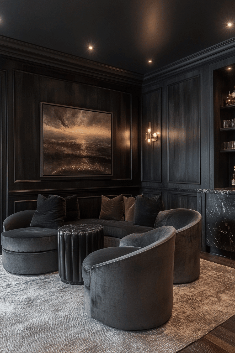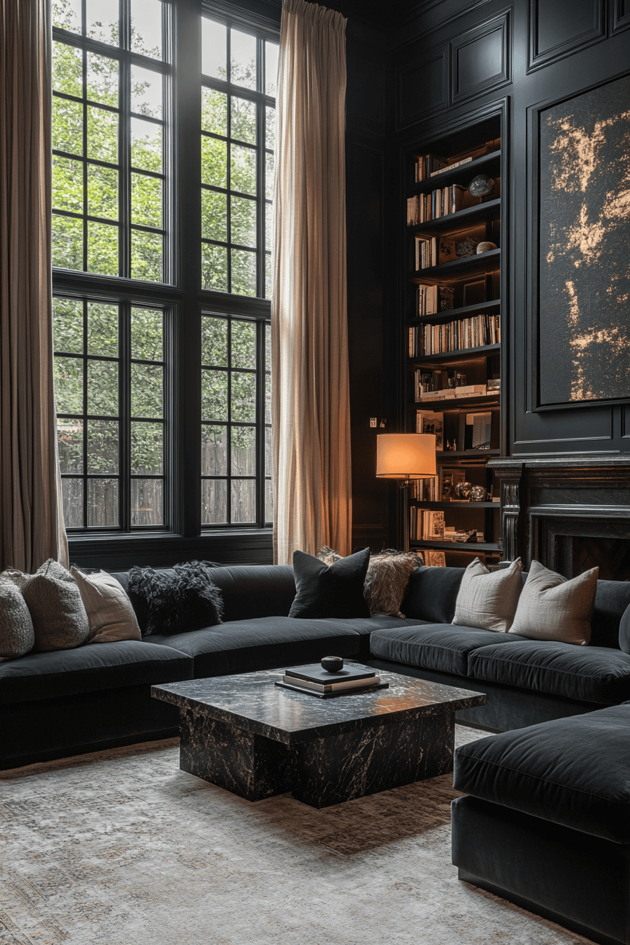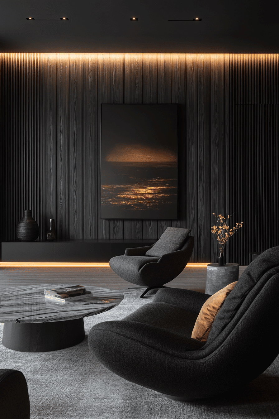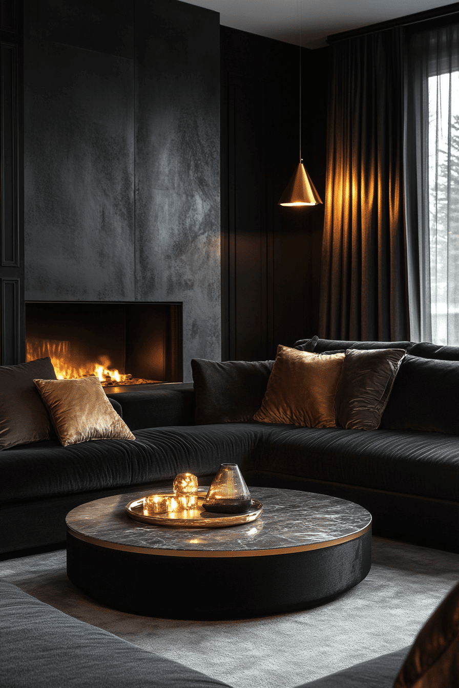 The luxe charcoal living concept pairs rich textures with upscale details. Think velvet sofas, marble coffee tables, and gold-accented lighting in a dark grey living room backdrop. Add blackout curtains and large-scale wall art to complete the look. Balance is key—mix matte and glossy elements throughout. The result is bold, opulent, and deeply modern. Click for luxe living room inspiration!