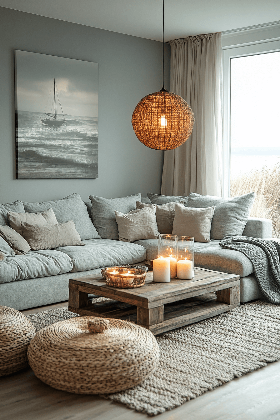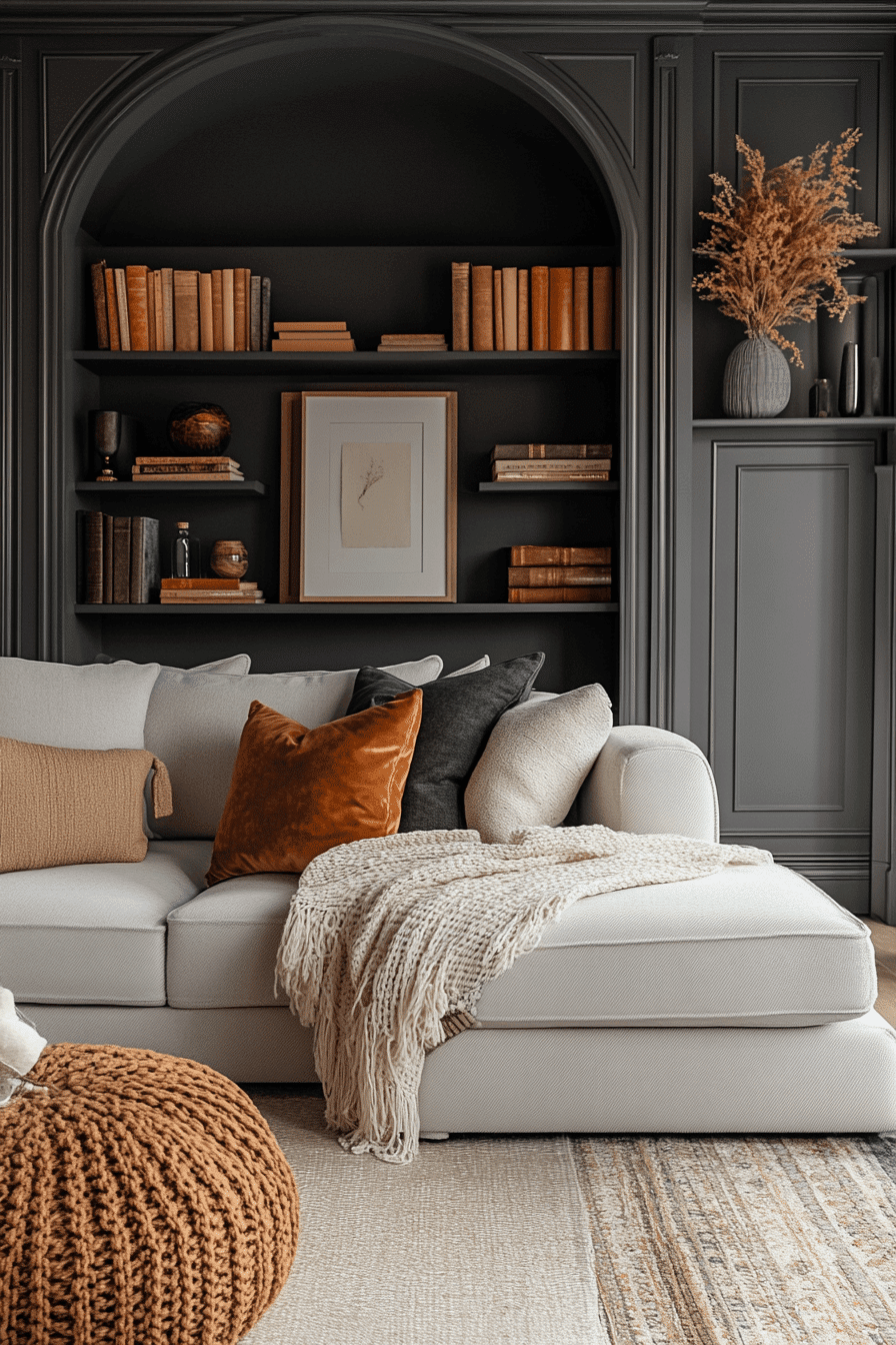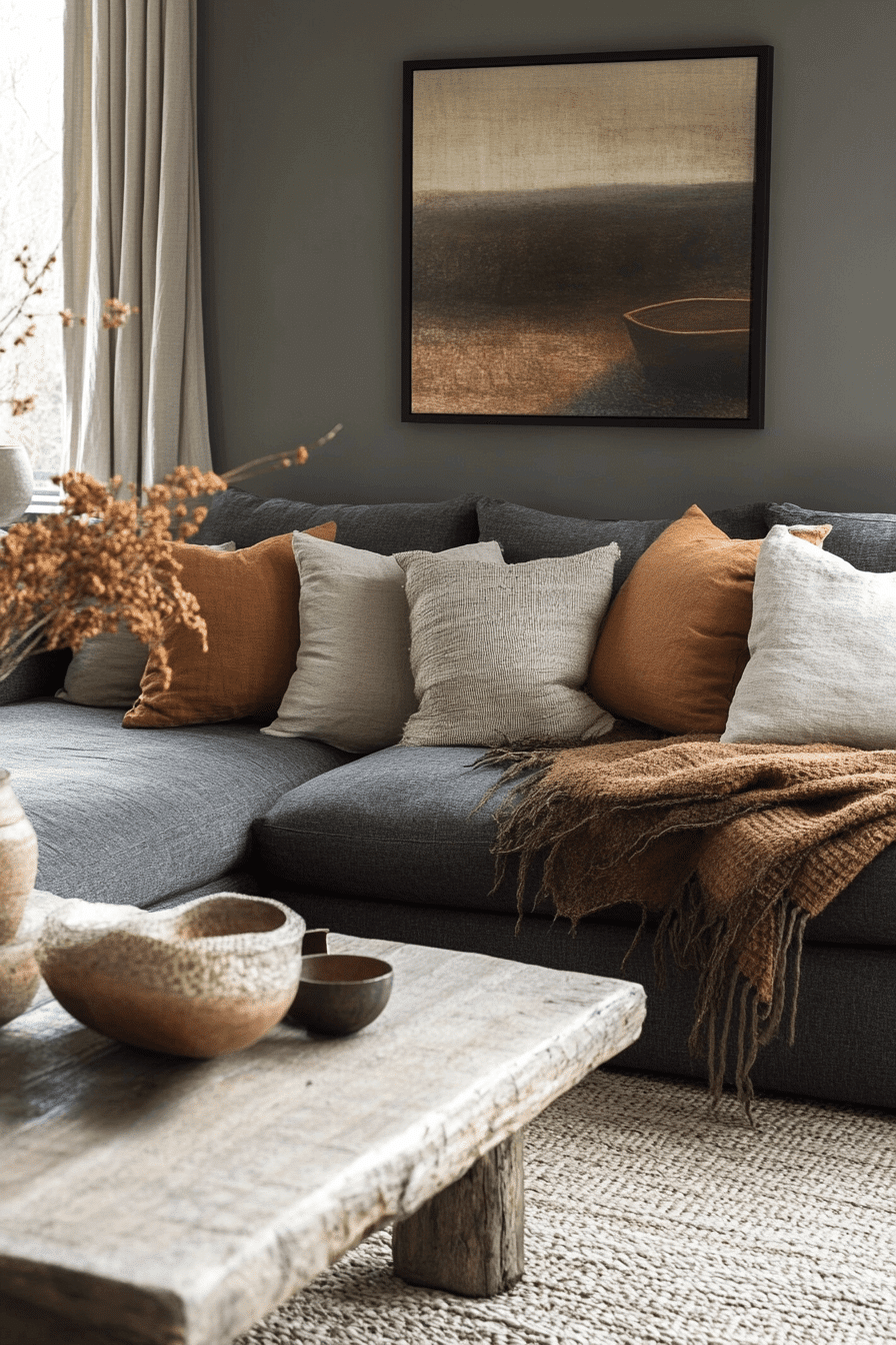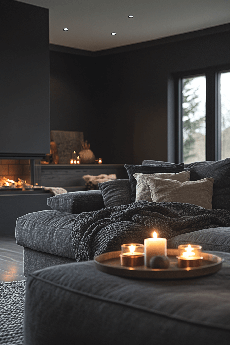 A cozy charcoal living look proves that darker palettes can feel warm and inviting. This dark grey living room layers plush sofas, knit throws, and soft lighting for comfort. Charcoal walls create intimacy, especially in the evenings. Warm metals and natural textures soften the mood beautifully. The result feels snug without sacrificing style. Click to cozy up your living room with charcoal charm!