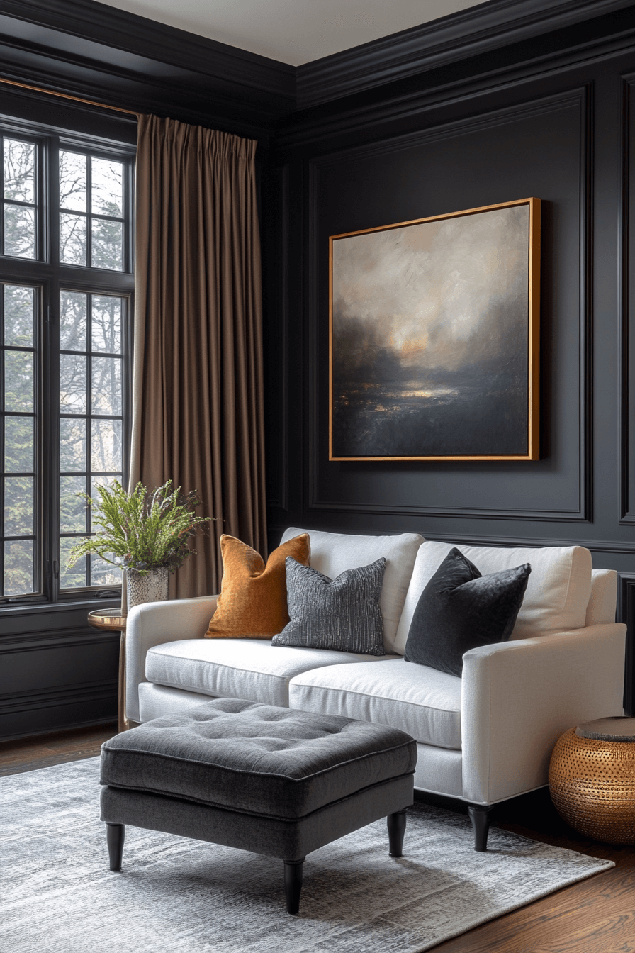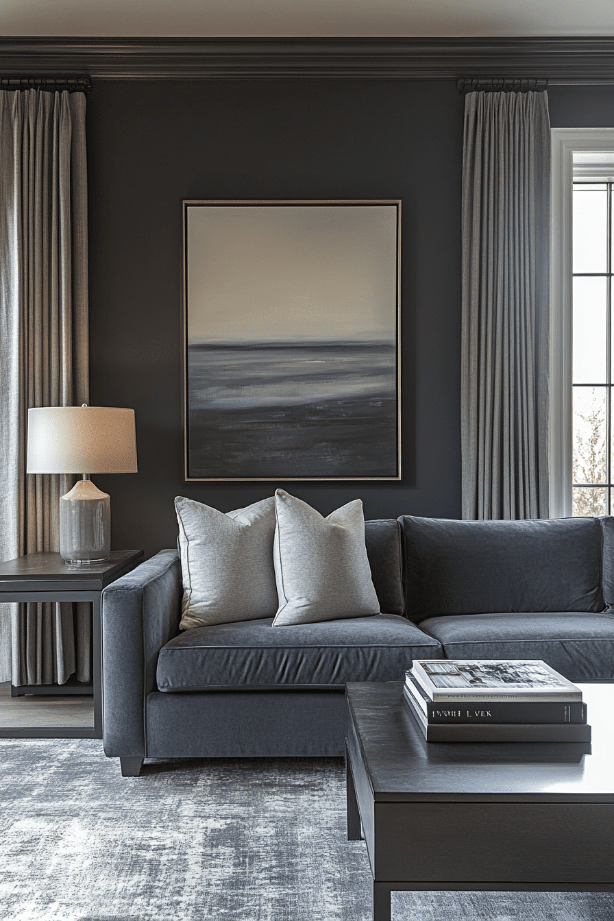 Light meets dark grey creates striking contrast with a fresh, modern edge. In this dark grey living room, darker walls are balanced by light furniture and accents. The interplay keeps the space dynamic and bright. Strategic lighting enhances the contrast beautifully. The look feels bold yet approachable. Click to see light‑and‑dark grey living inspiration!
