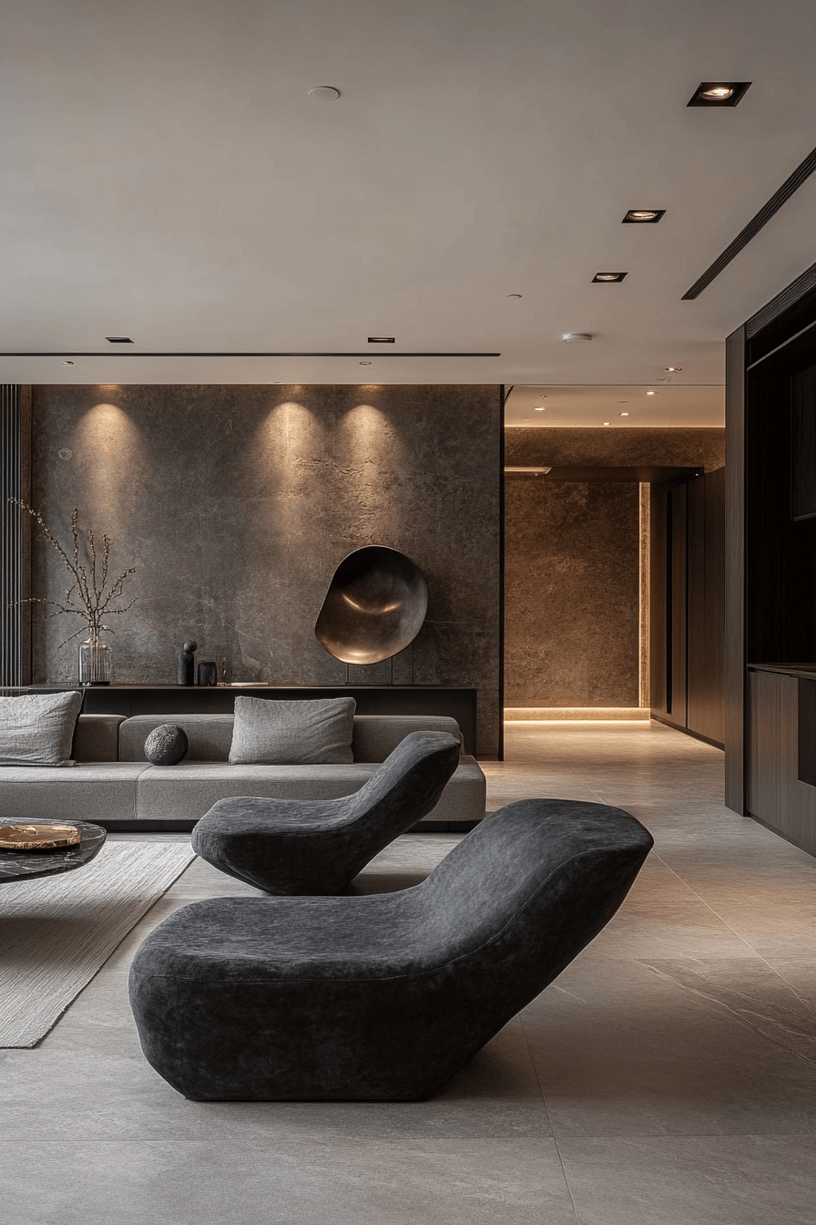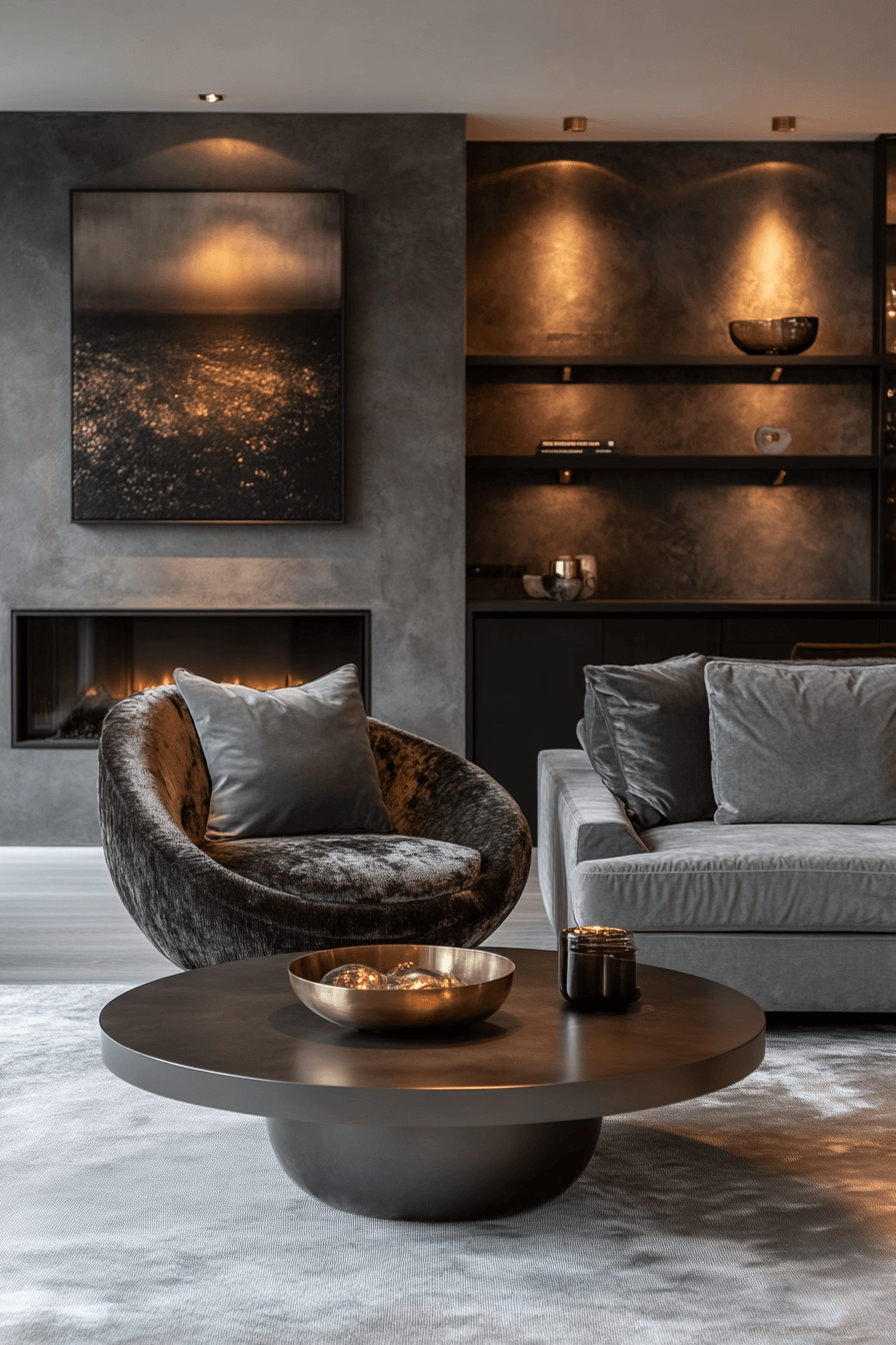 A textured dark grey interior adds richness through layered materials. This dark grey living room combines velvet, linen, leather, and woven accents. Texture keeps the monochrome palette visually engaging. Subtle lighting enhances every surface and detail. The space feels curated and tactile. Tap to experience texture‑rich grey interiors!