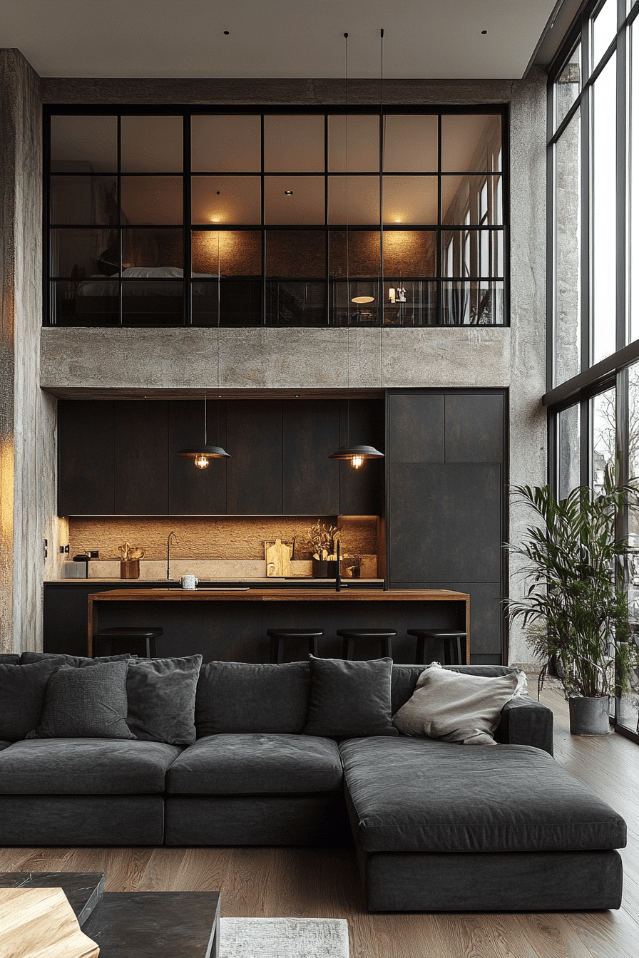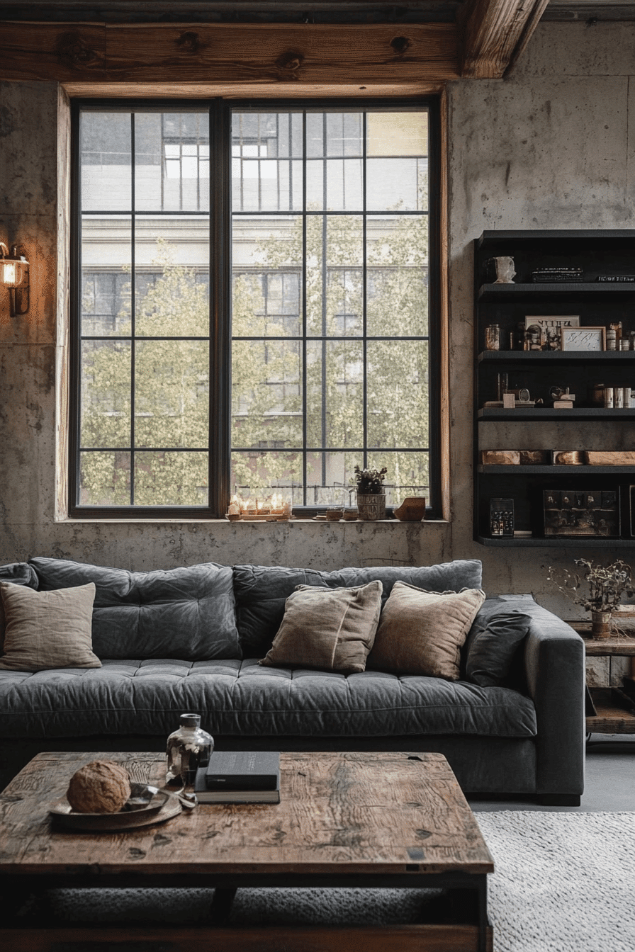 An industrial grey living area channels urban energy with raw textures and bold lines. The dark grey living room features concrete elements, metal accents, and structured furniture. Soft furnishings keep the look approachable and balanced. Exposed finishes add character and authenticity. This style feels edgy yet refined. Click to explore industrial grey living style!