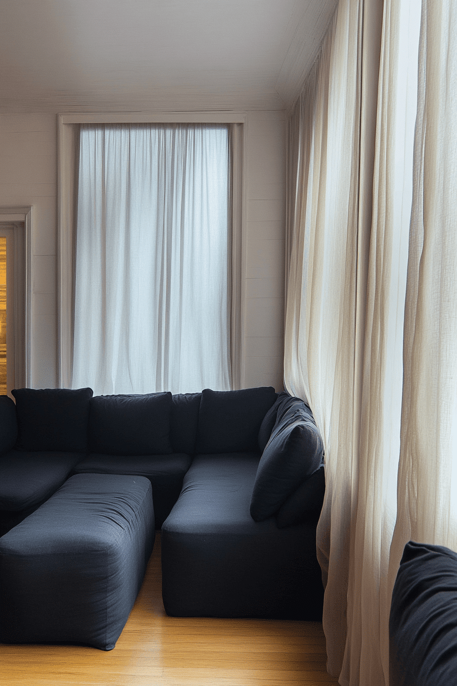 An airy yet dark lounge balances contrast for a fresh, modern feel. In this dark grey living room, deep tones are paired with light flooring and sheer curtains. Natural light keeps the space open and breathable. Soft furnishings and pale accents add visual lift. The look is moody yet surprisingly light. Click to discover airy grey living inspiration!