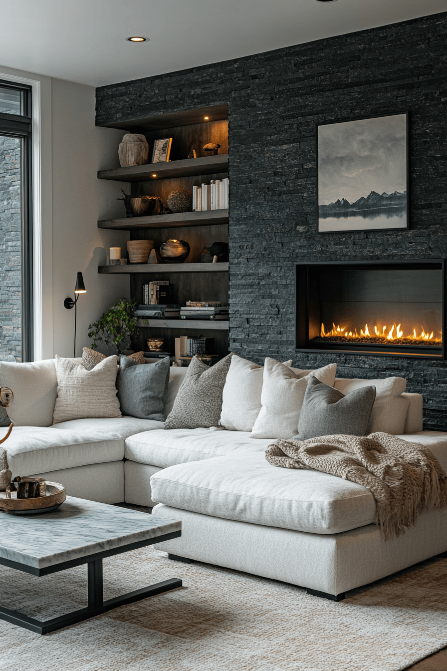 The contemporary dark grey setting thrives on geometric shapes, mixed materials, and cool color layering. Grey-on-grey decor, from the sectional to the walls, forms a seamless aesthetic. Break it up with white trim, artwork, or indoor plants. The space should feel fluid and curated. Ideal for a home that loves both comfort and design. Tap to see this look in action!