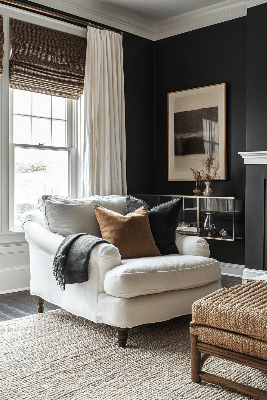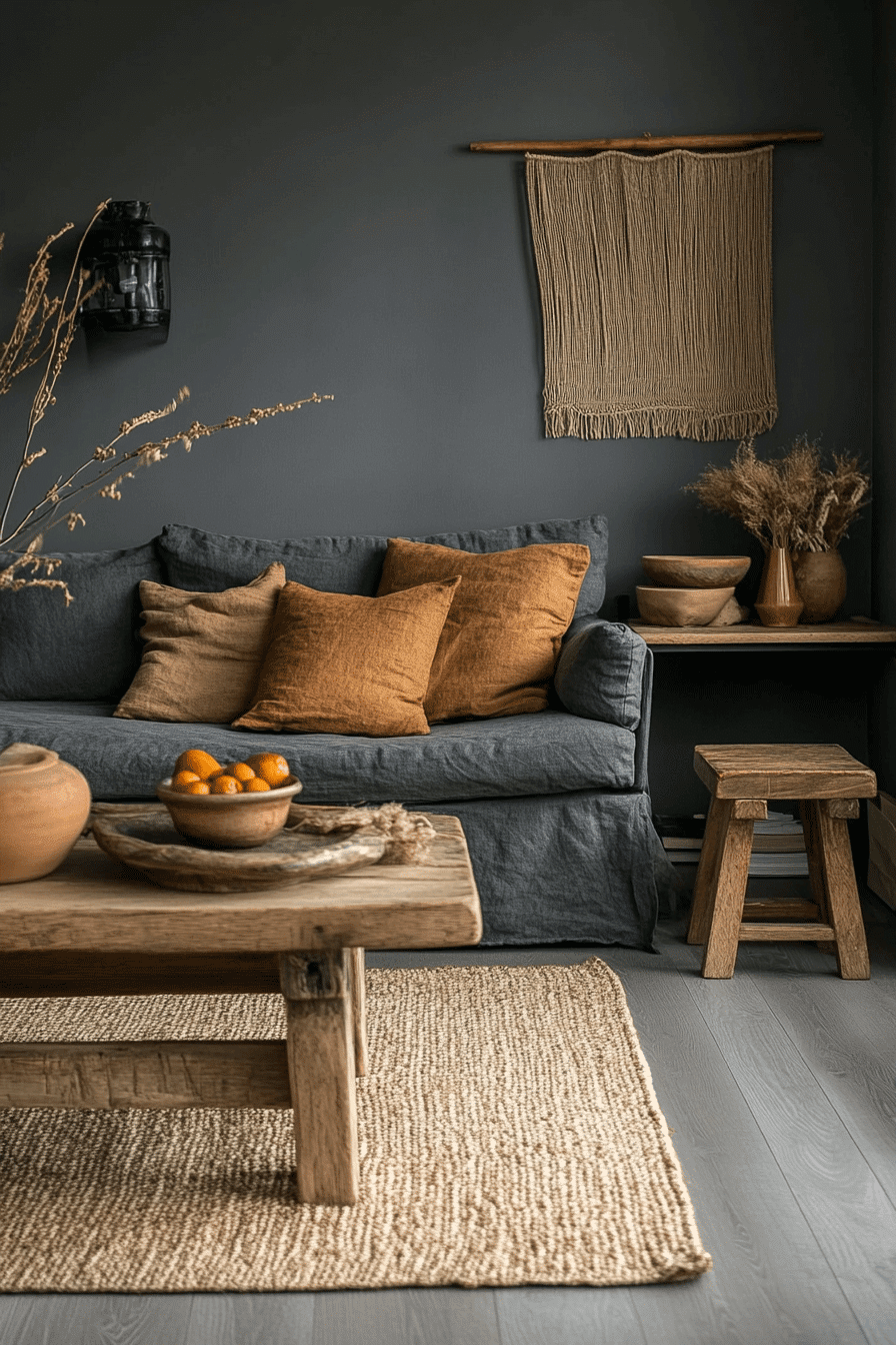 A neutral charcoal living style strikes the perfect balance between calm and contrast. This dark grey living room pairs charcoal walls with neutral furniture and soft textiles. The palette feels timeless and adaptable. Layered greys add depth without visual noise. It’s easy to style and endlessly versatile. Tap to see how neutrals shine in charcoal spaces!