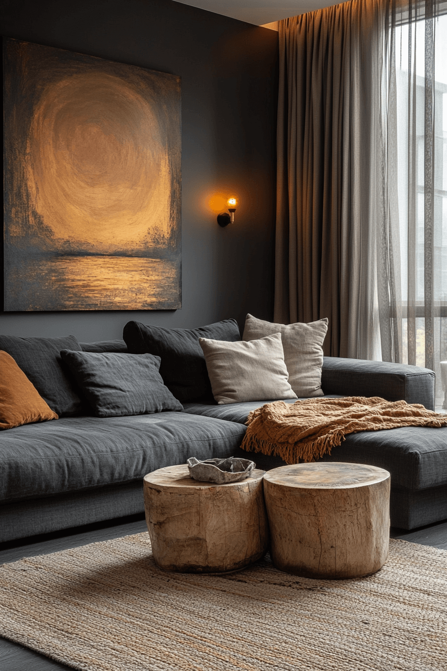 An earthy grey living concept brings nature-inspired calm into modern design. This dark grey living room mixes grey tones with wood, stone, and organic textures. Warm lighting enhances the earthy palette beautifully. The result feels grounded and soothing. Perfect for relaxed, natural interiors. Tap to explore earthy grey living ideas!