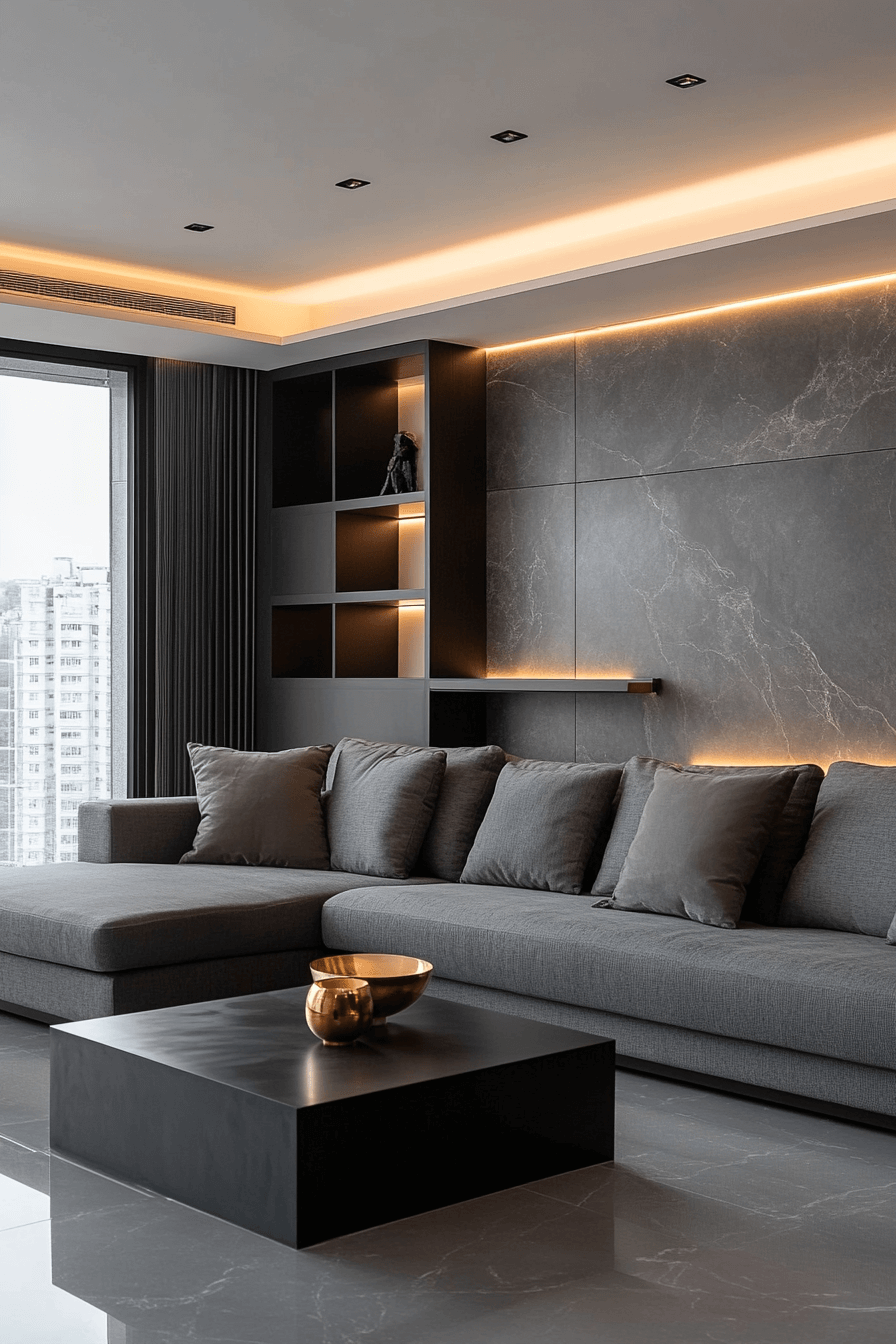 A monochrome modern living room embraces grey tones across every element—from floors to ceiling. The dark grey living room features subtle shifts in hue and texture to avoid flatness. Include sculptural furniture and abstract art for modern depth. Lighting should be clean and architectural. This space makes a big statement with quiet restraint. Tap now to unlock the power of monochrome design!