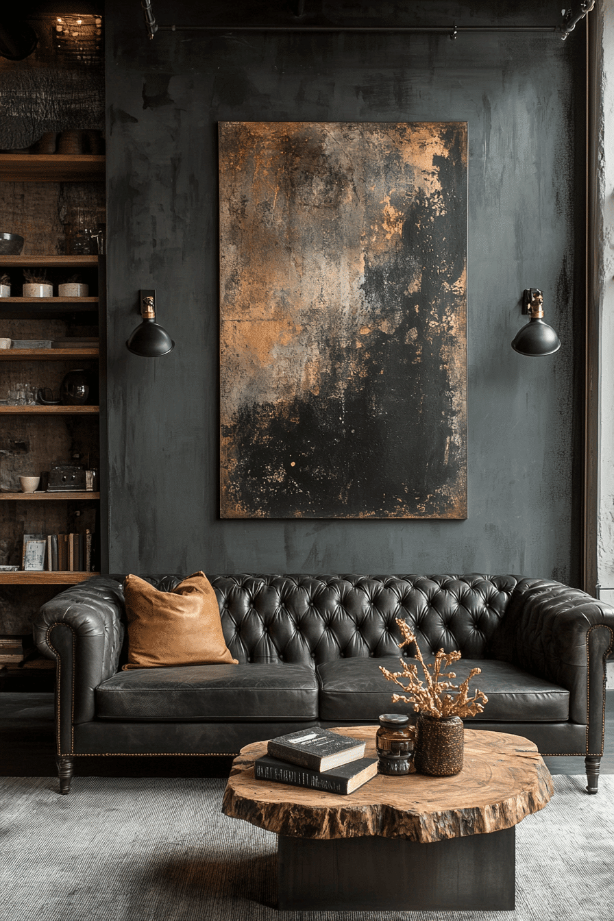 A masculine grey lounge vibe delivers confidence through clean lines and bold contrasts. In this dark grey living room, structured seating and darker finishes take the lead. Leather, metal, and wood accents reinforce the strong aesthetic. Minimal decor keeps the look sharp and intentional. It’s modern, grounded, and stylish. Click to explore masculine grey living ideas!