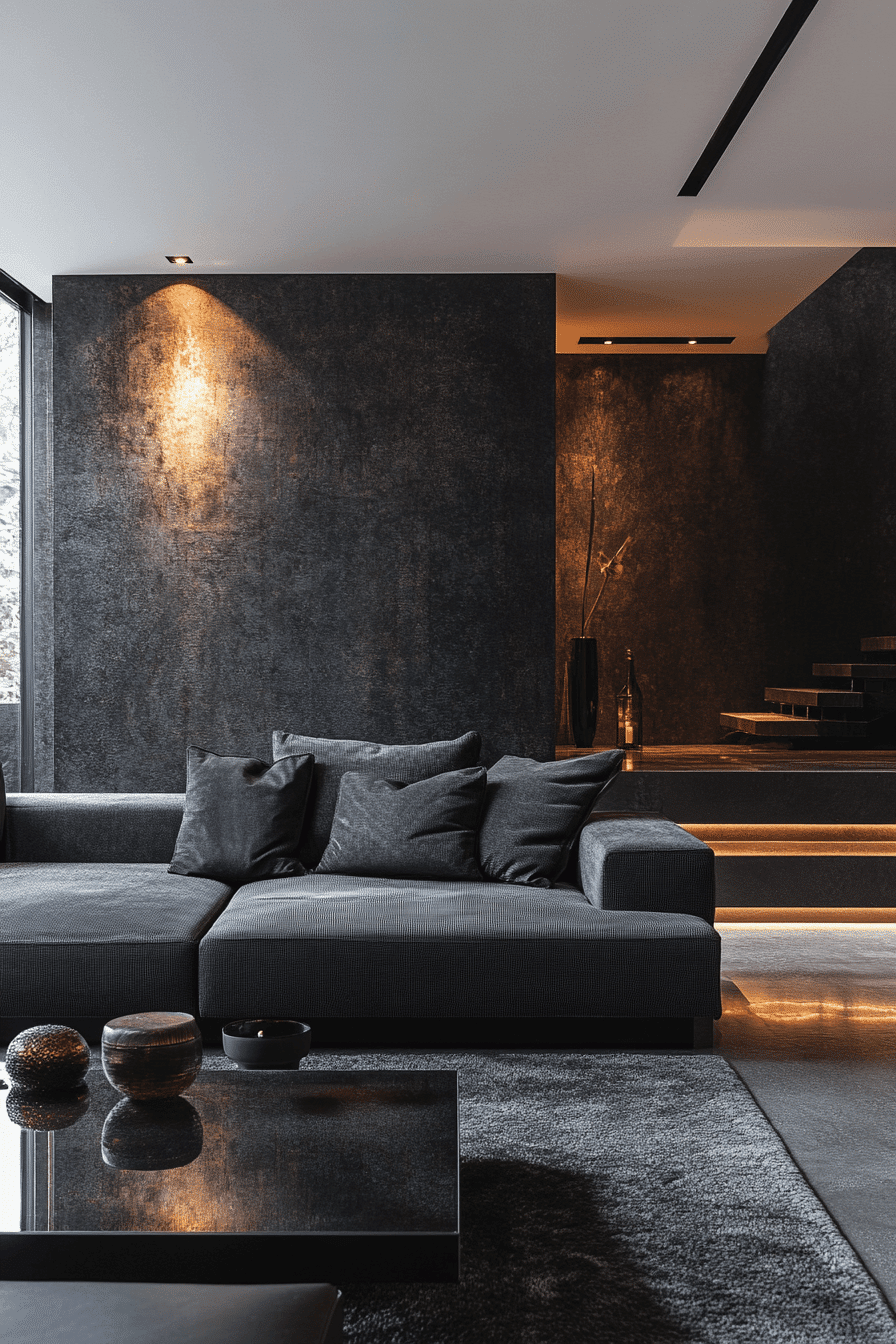 A textured dark grey interior adds richness through layered materials. This dark grey living room combines velvet, linen, leather, and woven accents. Texture keeps the monochrome palette visually engaging. Subtle lighting enhances every surface and detail. The space feels curated and tactile. Tap to experience texture‑rich grey interiors!