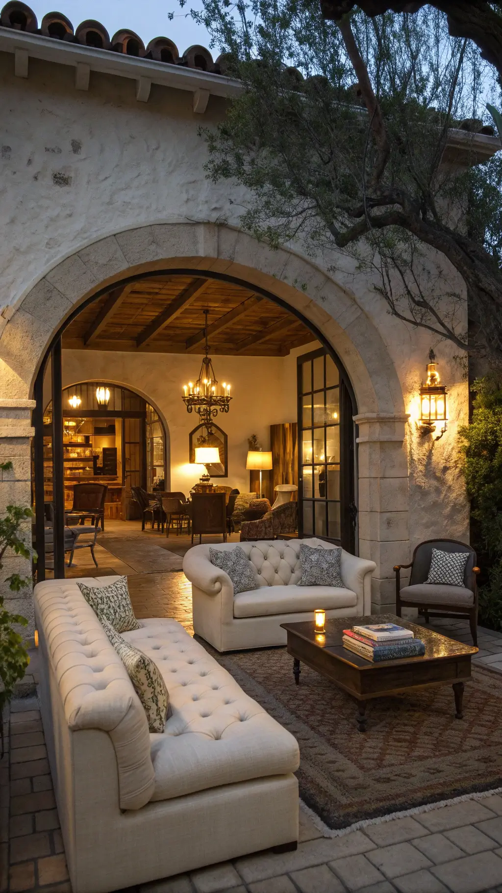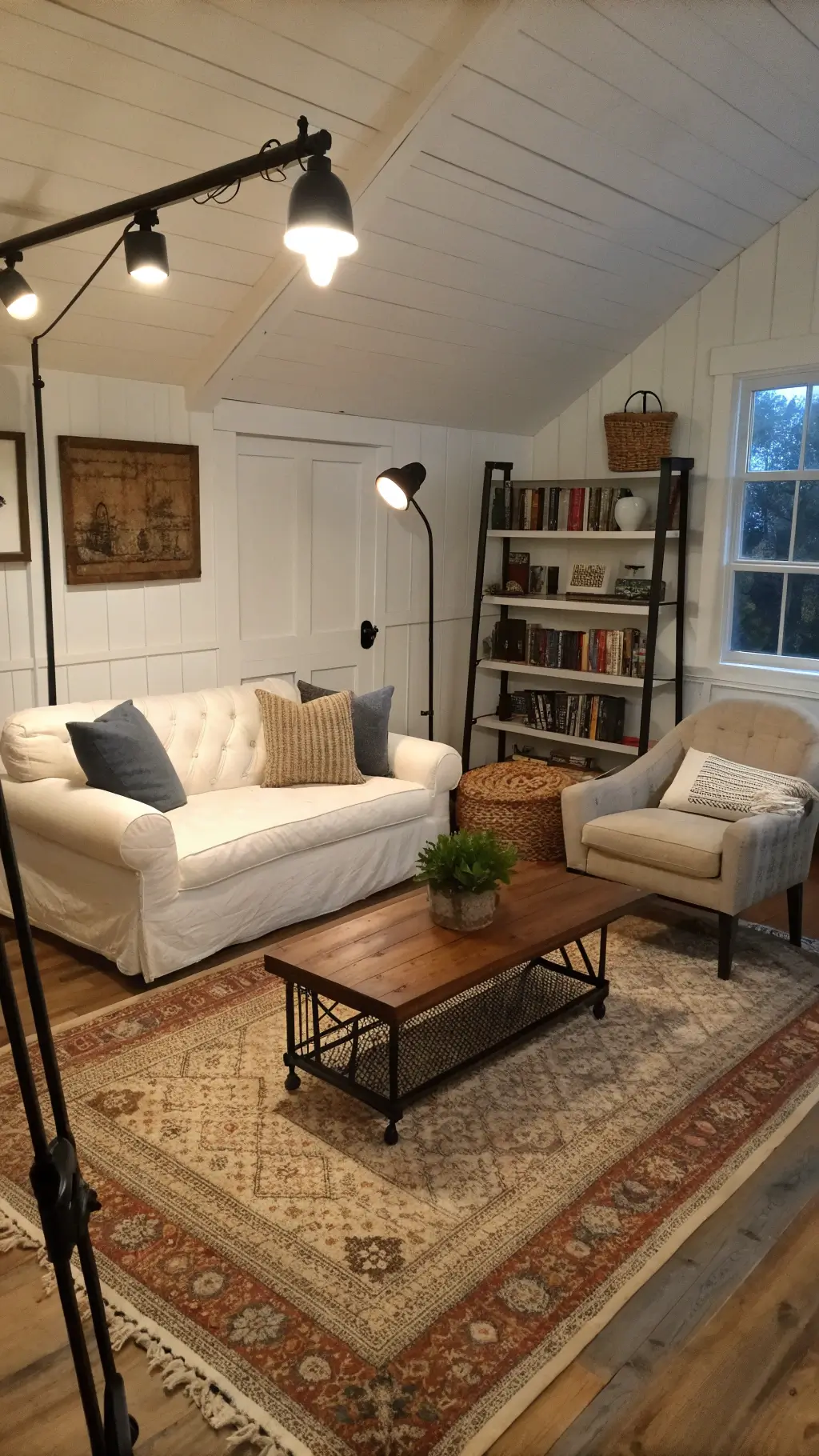 Cozy 14x16ft sitting room at twilight with blue shadows, featuring a petite English roll arm sofa, matching swivel chairs, a round metal and wood coffee table, black iron sconces, ceramic table lamps, wool throws, vintage grain sack pillows, and wooden dough bowls on floating shelves.