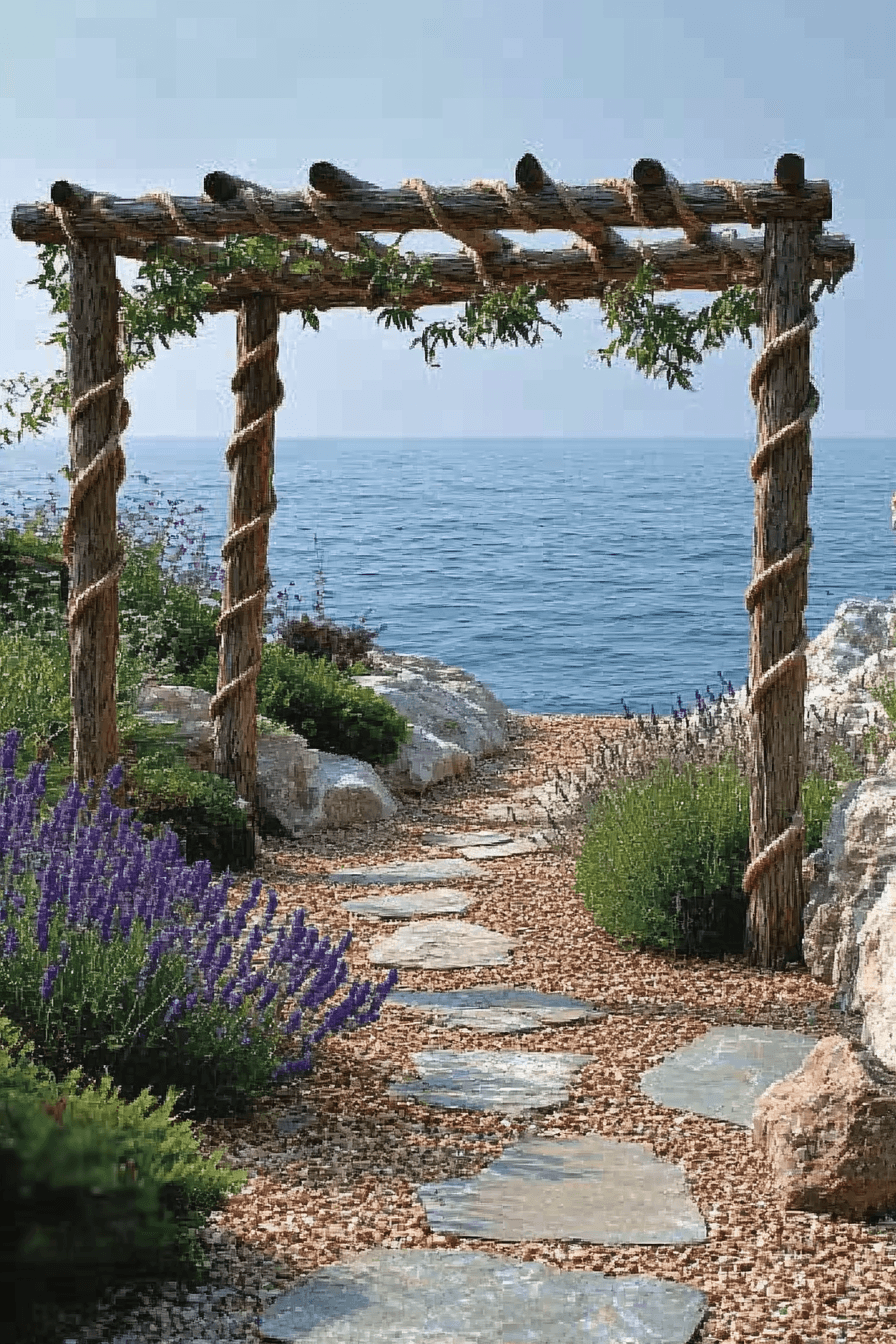 For a coastal-inspired twist, garden arbor ideas featuring rope and weathered wood create a relaxed seaside vibe. Thick ropes woven through a rustic frame give the structure a nautical feel that’s perfect for beach-style landscapes. Climbing plants can wind through the ropes, softening the look while adding greenery. The combination feels casual, breezy, and full of character. It’s a great way to bring coastal charm into your garden. Explore more garden arbor ideas with a nautical touch.