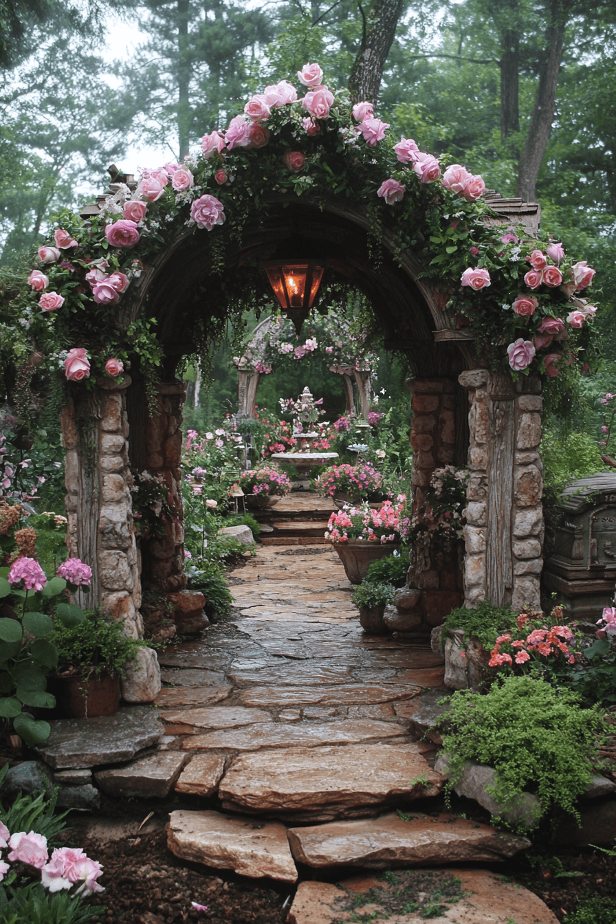 Add a playful, magical touch to your yard with garden arbor ideas designed for a whimsical fairy-inspired setting. Smaller structures decorated with lights, bright colors, and charming accents create a storybook feel. Delicate climbing flowers enhance the fantasy look, making the space feel enchanting and fun. It’s especially perfect for kids’ gardens or creative outdoor corners. The design feels joyful and full of personality. Click to explore more garden arbor ideas with a whimsical vibe.