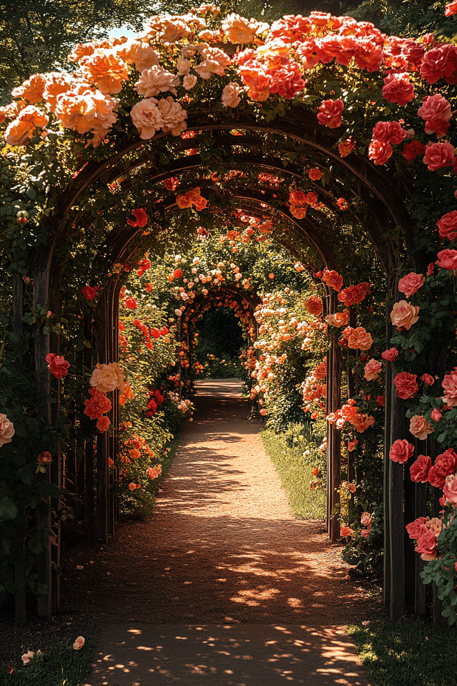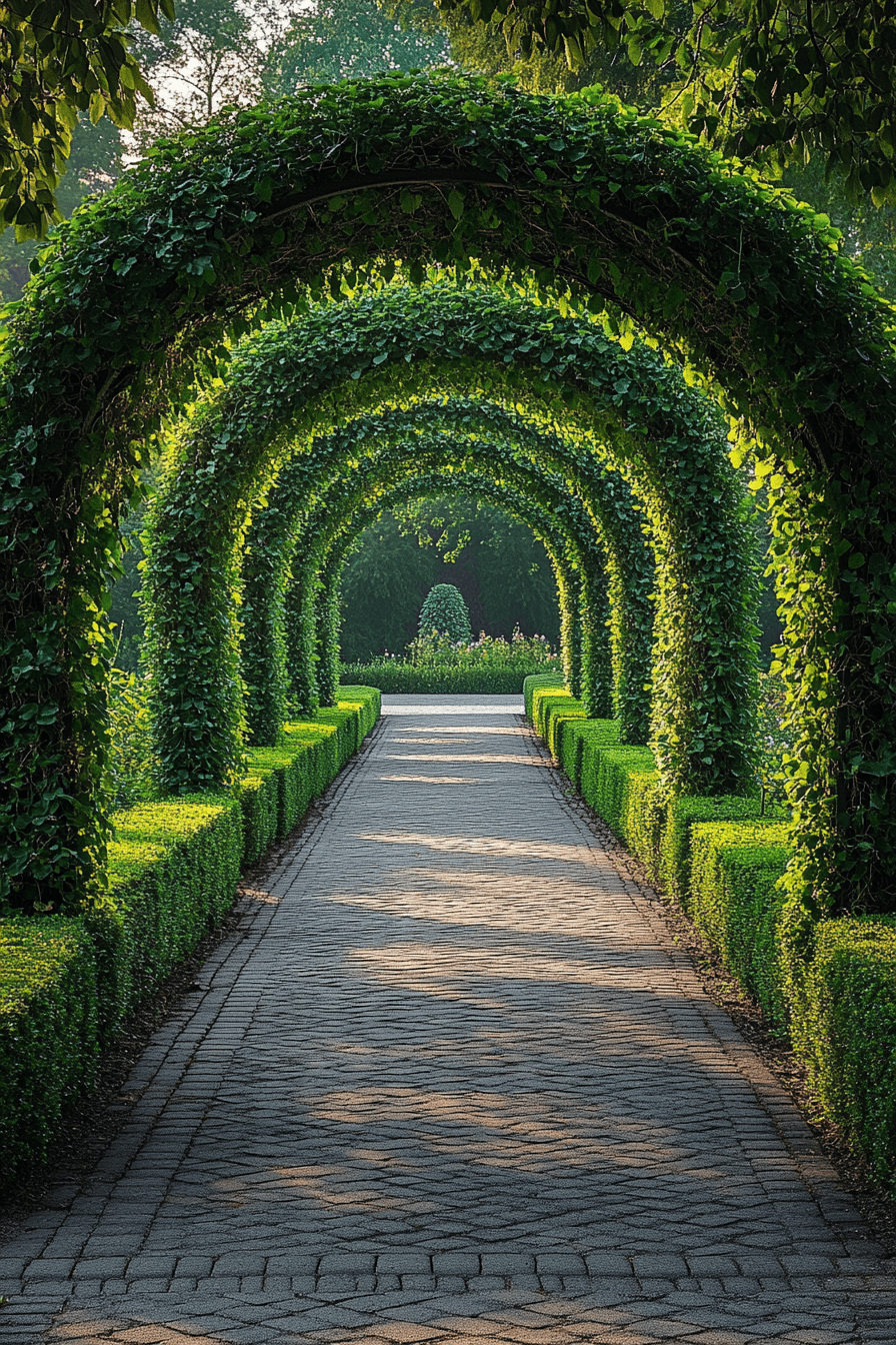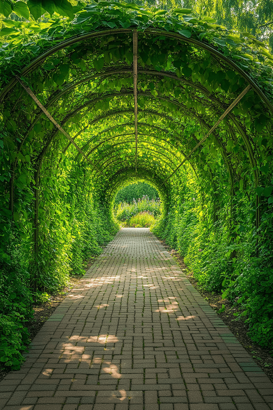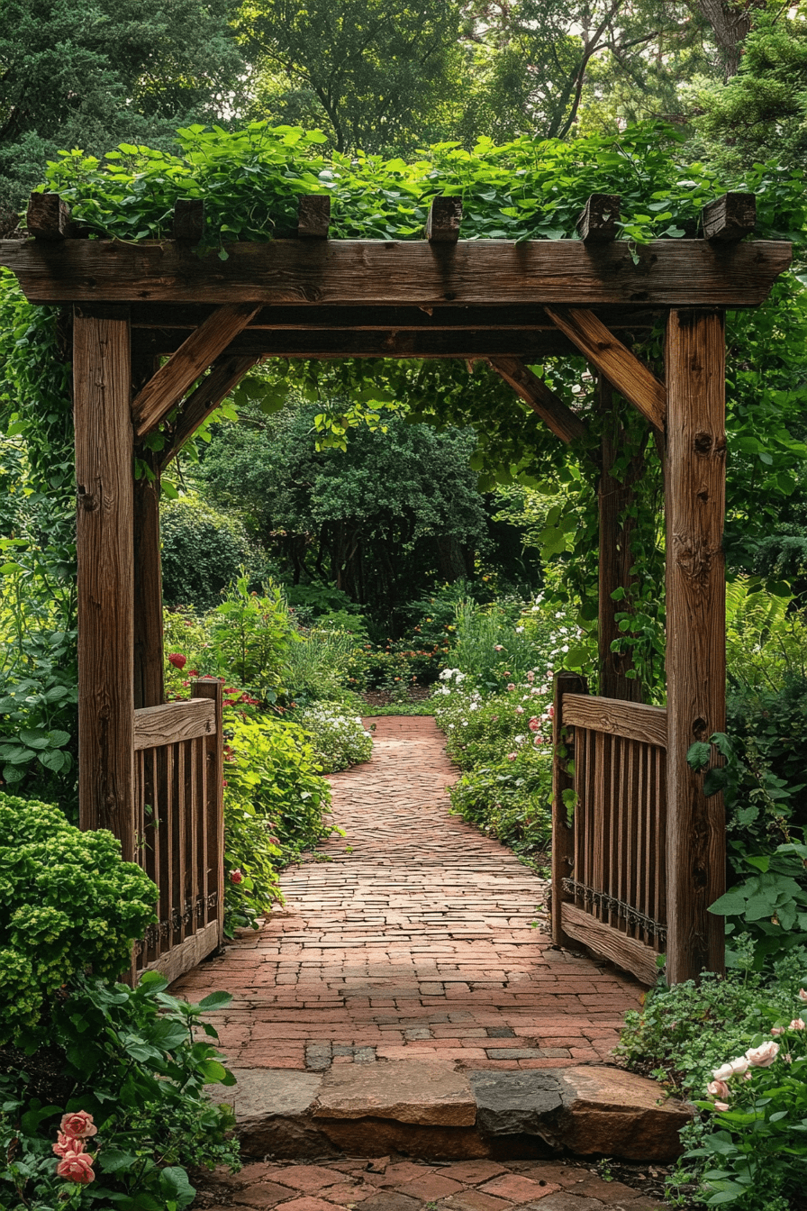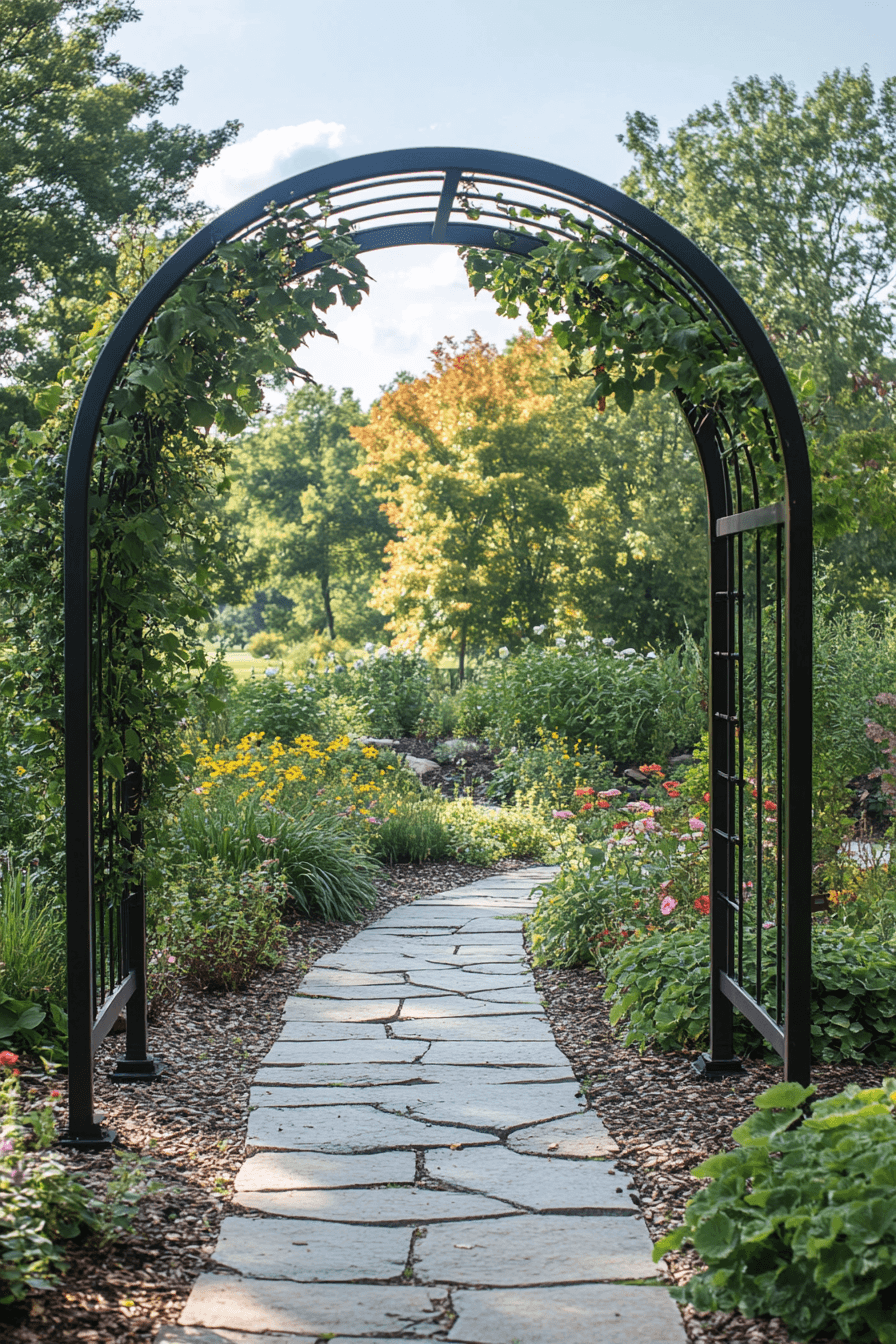 A dramatic walkway comes to life with garden arbor ideas that create a lush, green tunnel overhead. Dense climbers like ivy or honeysuckle form a natural canopy that feels immersive and peaceful. The shaded pathway offers a cool retreat while adding visual impact to your landscape. It’s ideal for larger gardens or creating a secret garden vibe. Walking through it feels like entering another world. Explore more garden arbor ideas that create stunning garden pathways.