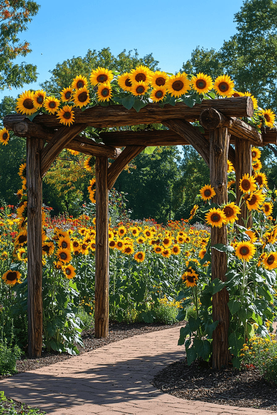 Bright and cheerful, garden arbor ideas featuring sunflowers can instantly energize your outdoor space. Tall blooms surrounding a simple frame create a vibrant and welcoming entrance. Their bold yellow tones bring warmth and happiness, especially in sunny areas. This style works beautifully as a seasonal feature or a fun photo backdrop. It’s a lively way to celebrate the beauty of summer. Tap to find more garden arbor ideas bursting with color.