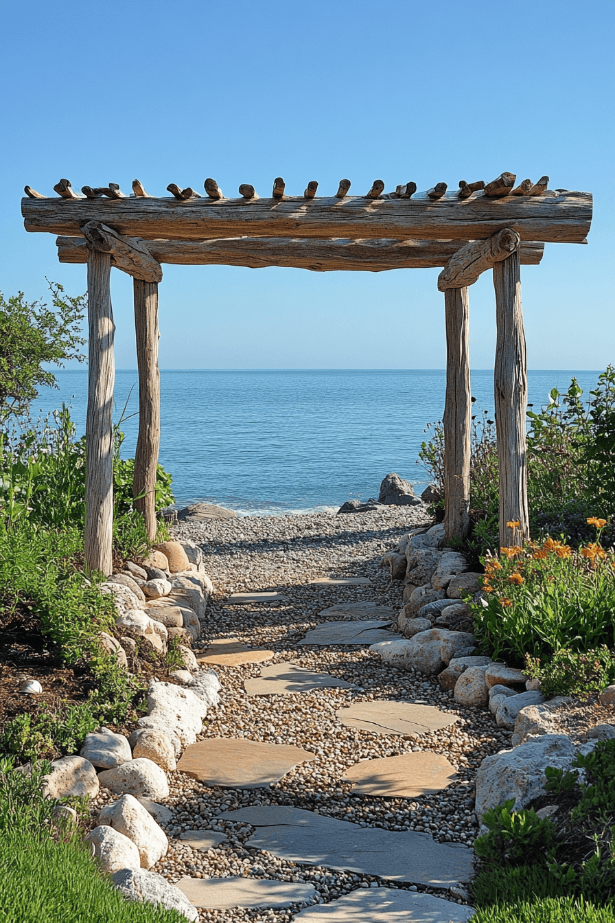 For seaside settings, garden arbor ideas designed with durable materials and coastal accents create a relaxed, beachy atmosphere. Treated wood, driftwood details, and subtle shell elements bring in natural ocean-inspired charm. Climbing plants that thrive in coastal conditions add softness to the structure. The overall look feels breezy, casual, and perfectly suited for waterfront homes. It’s a great way to extend that coastal vibe into your garden. Click to explore more garden arbor ideas with a beach-inspired feel.