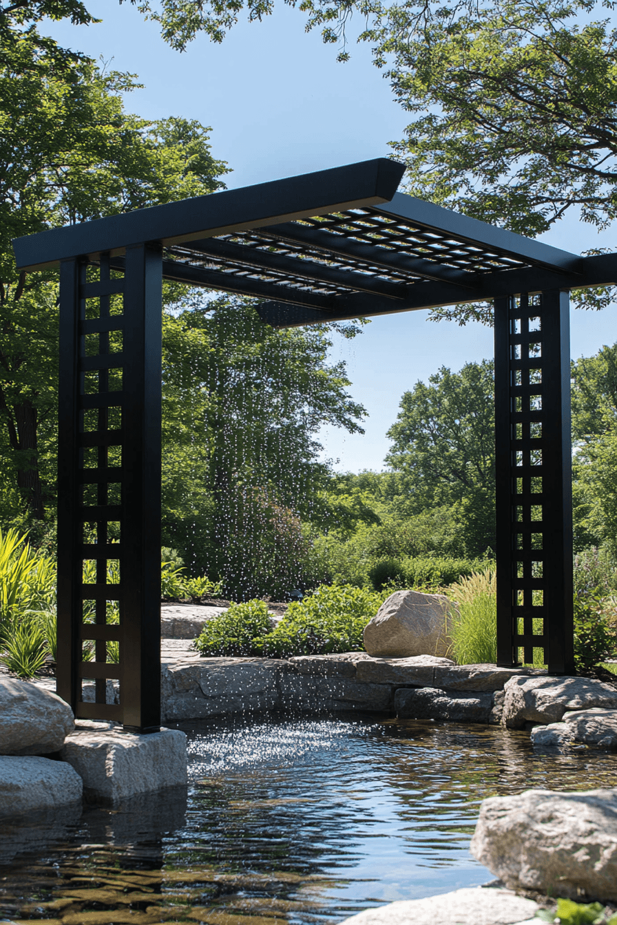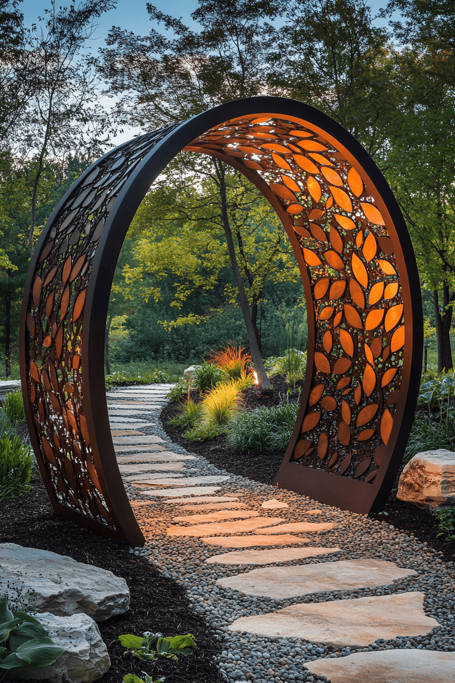 For a clean and contemporary look, minimalist metal structures stand out among modern garden arbor ideas. Sleek finishes in black or metallic tones create a striking contrast against soft greenery. These simple arches feel refined and durable while requiring very little upkeep. They work beautifully as standalone features or as frames for sculptures or water elements. The design feels fresh, bold, and effortlessly stylish. Tap to uncover more garden arbor ideas with minimalist metal designs.