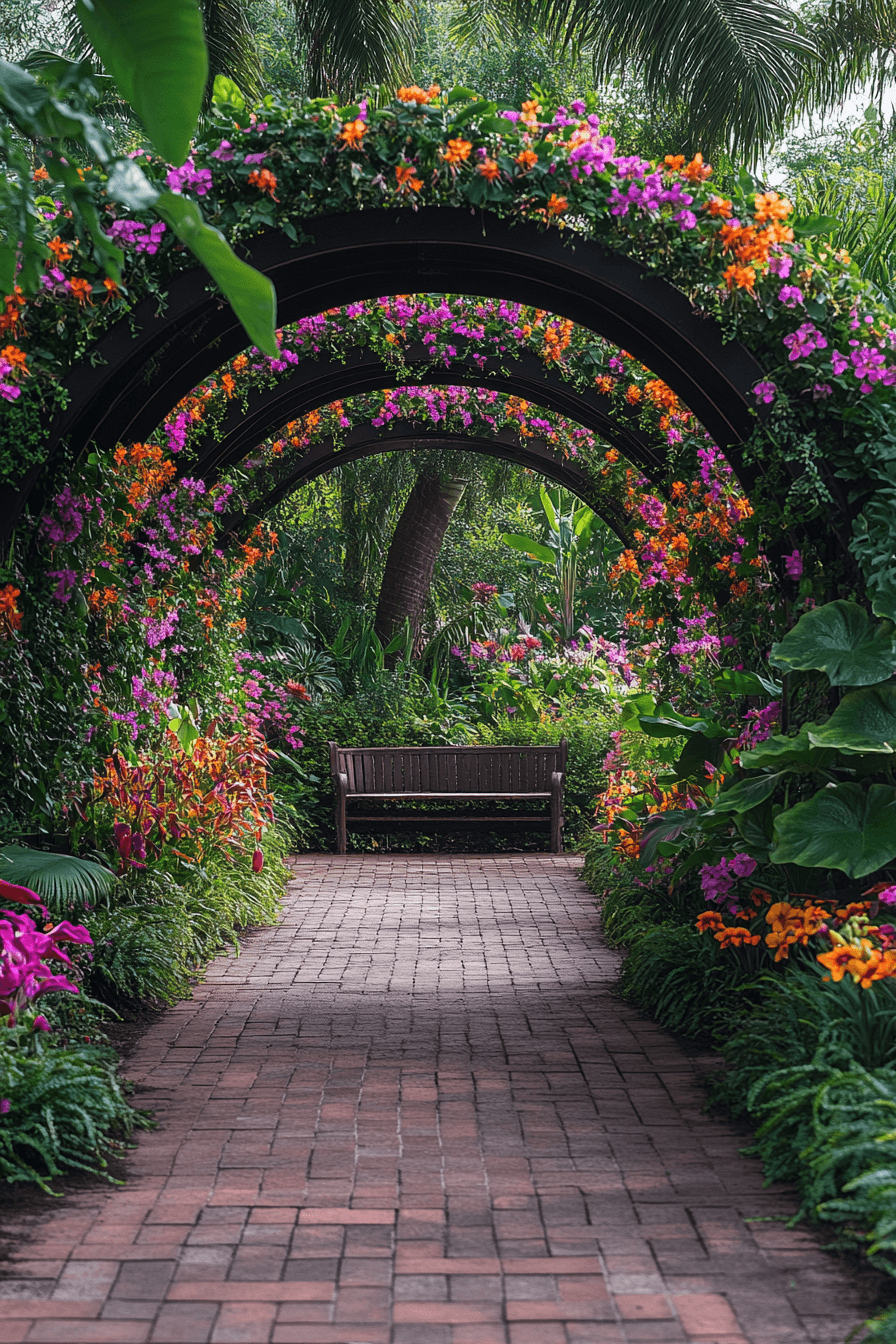 Bring a vacation-like vibe home with garden arbor ideas that feature tropical climbing plants. Vines like passionflower or jasmine create dense, lush coverage that adds shade and texture. A strong structure supports the vibrant growth while enhancing the exotic look. The result feels like a private oasis right in your backyard. It’s an easy way to add warmth and escape into your outdoor space. Discover more garden arbor ideas that create a tropical paradise.