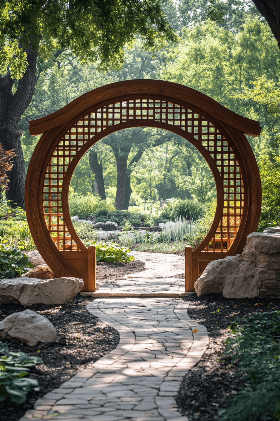 A circular design adds a unique architectural touch to garden arbor ideas inspired by traditional moon gates. This striking shape creates a sense of movement and invites you to step through into another space. Climbing flowers like morning glories can frame the structure beautifully, enhancing its visual appeal. It works as both an entrance and a statement feature. The look feels timeless, symbolic, and captivating. Click to uncover more garden arbor ideas with architectural flair.