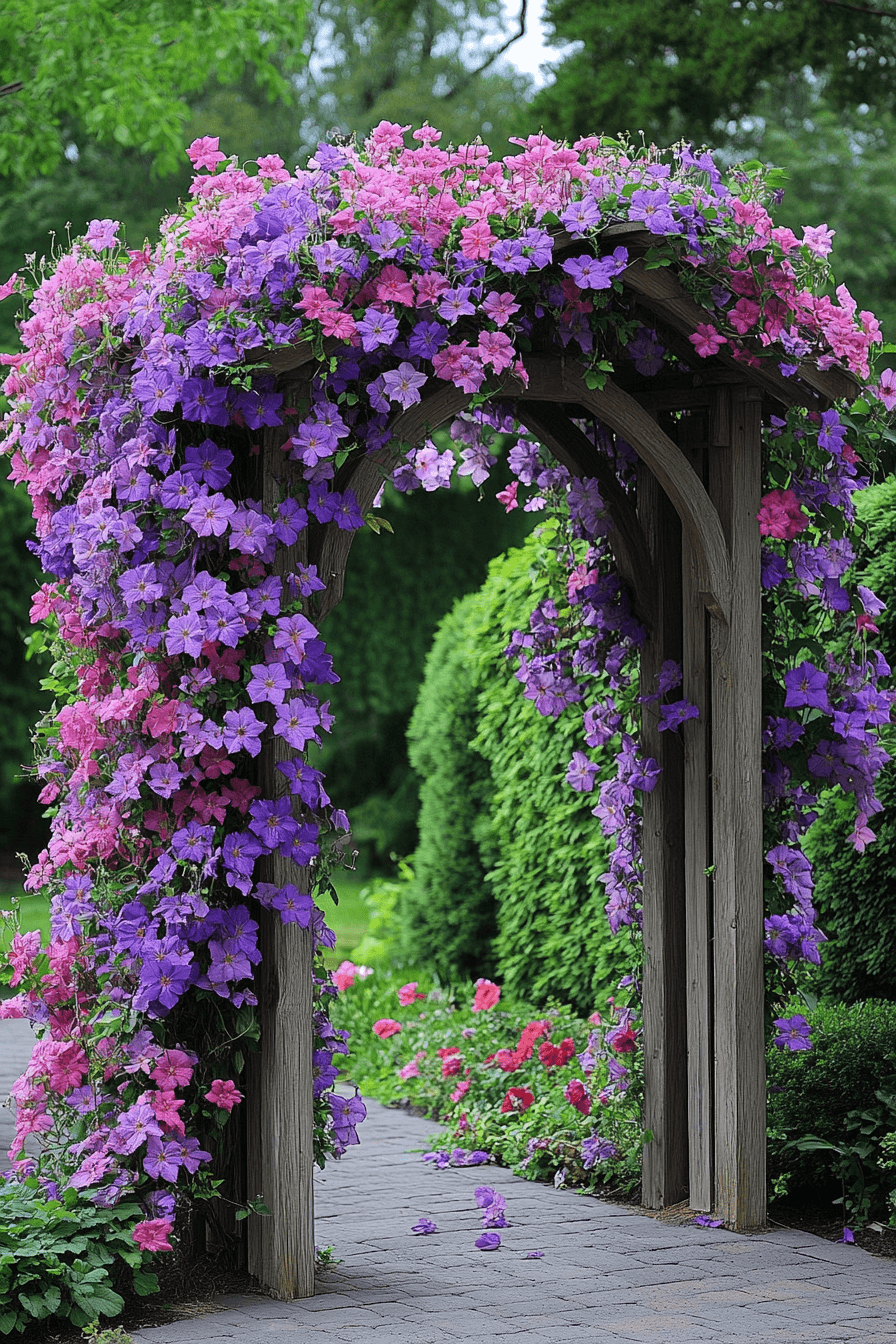 Bright blooms and vertical beauty shine through garden arbor ideas that highlight cascading clematis. These climbing flowers create a colorful display that adds depth and movement to any space. Mixing different varieties can extend blooming time and keep the arbor vibrant longer. It’s perfect for entrances, pathways, or as a standout focal point. The result feels lively, elegant, and full of seasonal charm. Discover more garden arbor ideas that showcase stunning floral displays.