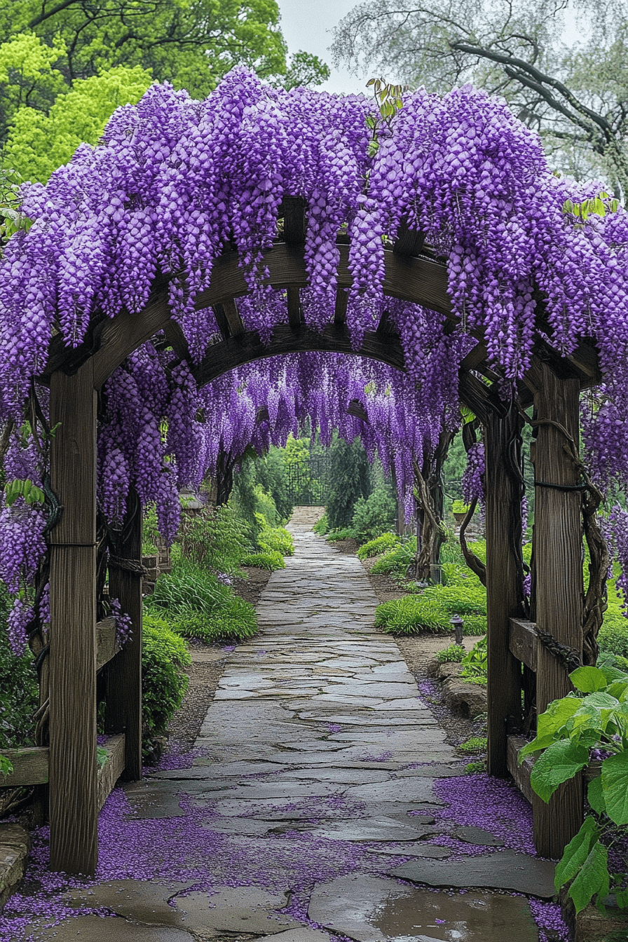 Few garden arbor ideas feel as enchanting as one covered in cascading wisteria blooms. The flowing flowers add elegance, color, and a soft fragrance that transforms any outdoor space. A sturdy wood or wrought iron frame provides the support needed for these lush vines. During peak bloom, the arbor becomes a breathtaking focal point. It’s perfect for creating a shaded path or a dreamy seating area. Explore more garden arbor ideas that bring floral elegance to life.