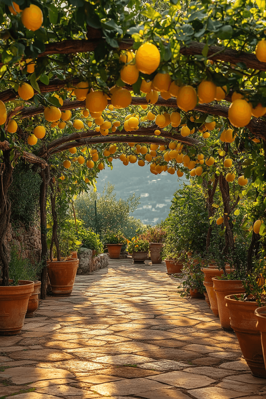 Bring a touch of the Mediterranean into your yard with garden arbor ideas designed to support fruit-bearing plants. Structures made from wood or wrought iron can hold grapevines or lemon trees, adding both beauty and function. This style maximizes vertical growing space while creating a warm, sun-soaked aesthetic. The combination of greenery and fruit makes the space feel vibrant and alive. It’s a perfect blend of practicality and charm. Click to explore more garden arbor ideas inspired by Mediterranean gardens.