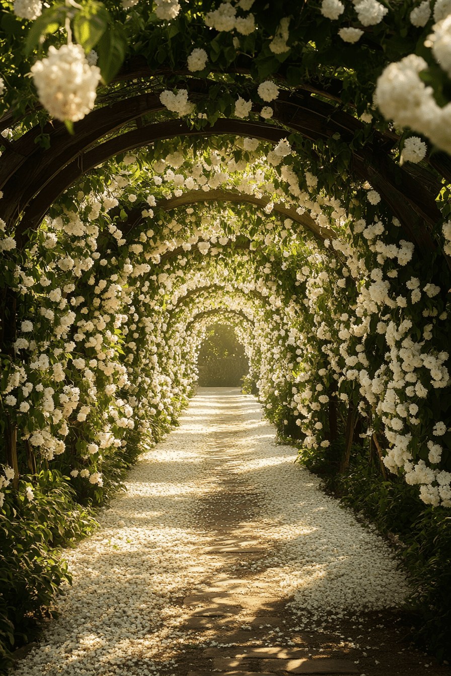 A dreamy walkway filled with fragrance and beauty comes to life with garden arbor ideas that feature cascading jasmine. A simple wood or metal frame becomes a romantic tunnel when covered in delicate white blooms. As the flowers climb and spread, they create a soft canopy that feels peaceful and inviting. The gentle scent adds a relaxing, almost spa-like atmosphere to your outdoor space. It’s perfect for quiet strolls or a secluded garden corner. Tap to explore more garden arbor ideas with floral charm.