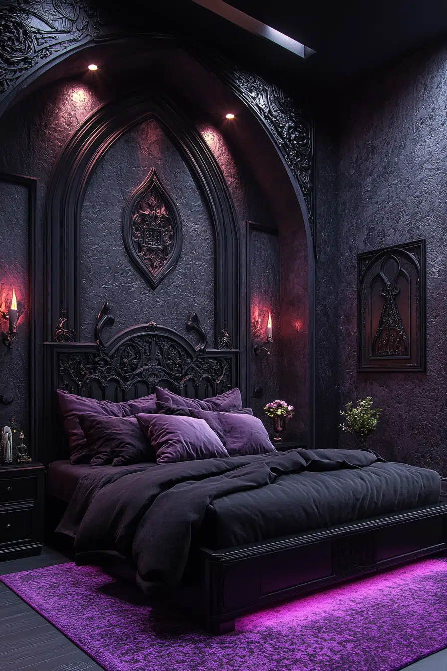 Design a gothic bedroom with romantic touches, using soft lighting and luxurious fabrics in red and black. Choose furniture with detailed carvings and install a canopy bed with flowing curtains. Add warmth with plush rugs and vintage gothic candelabras. This setup makes your gothic bedroom both cozy and inviting.