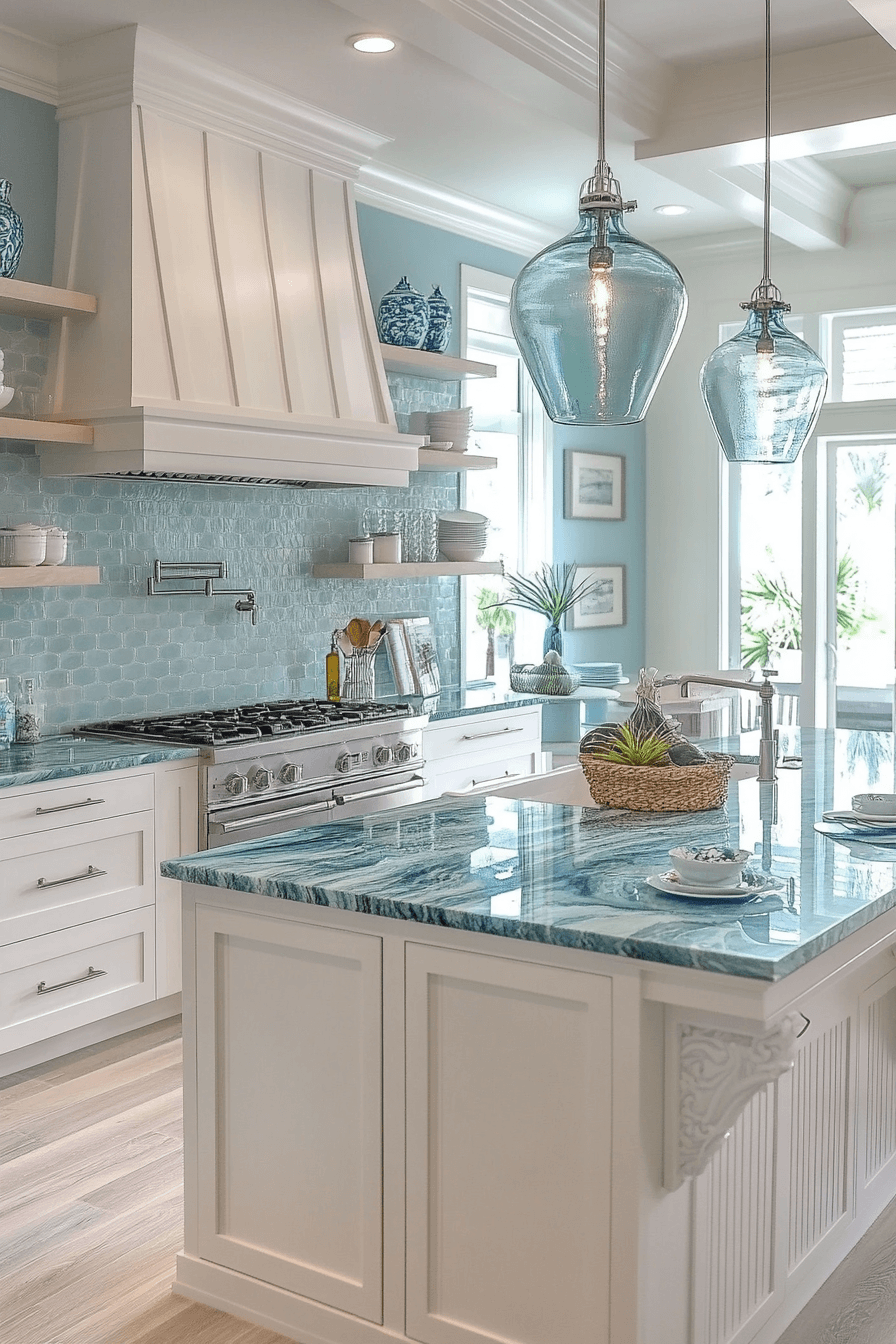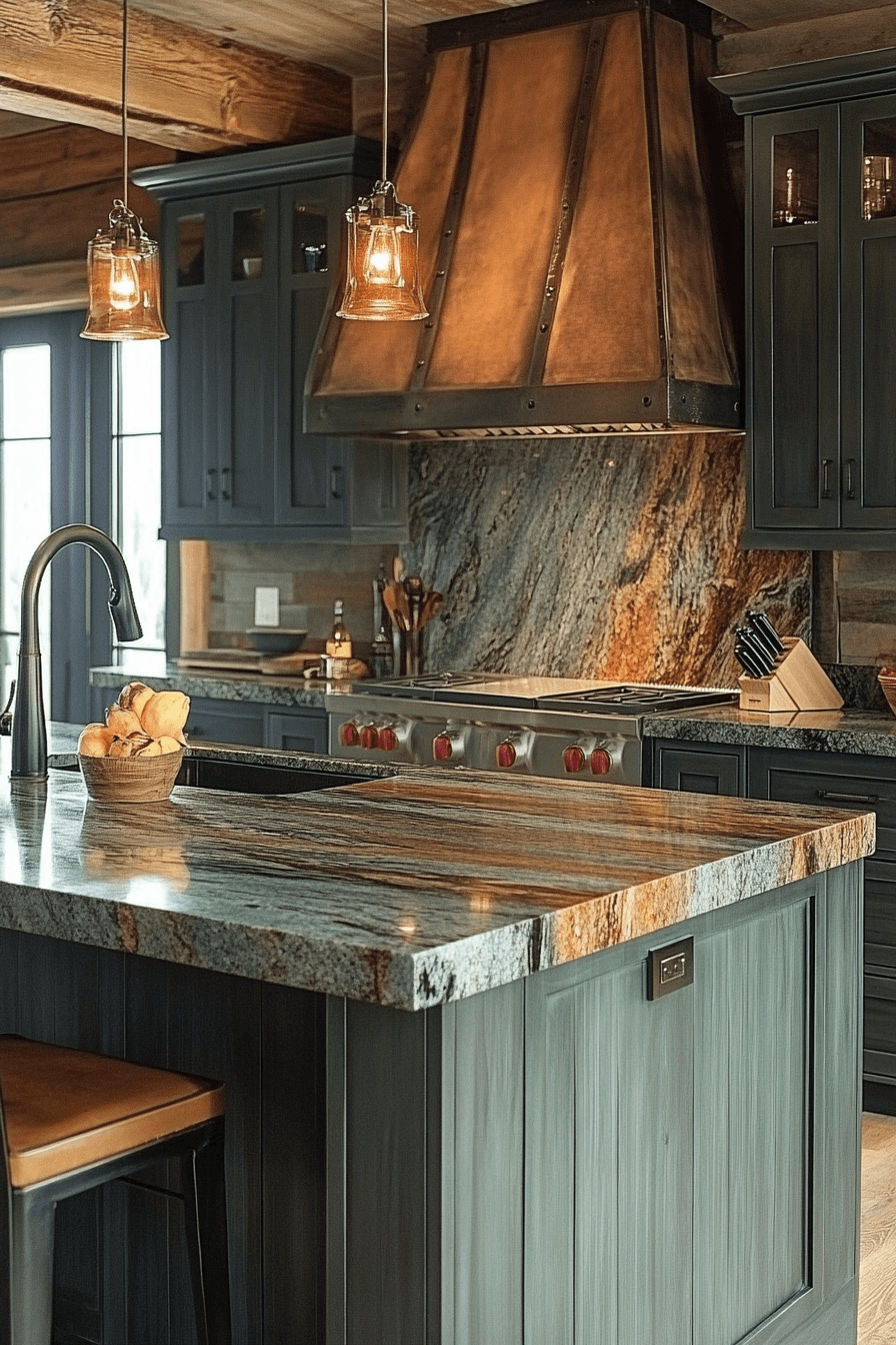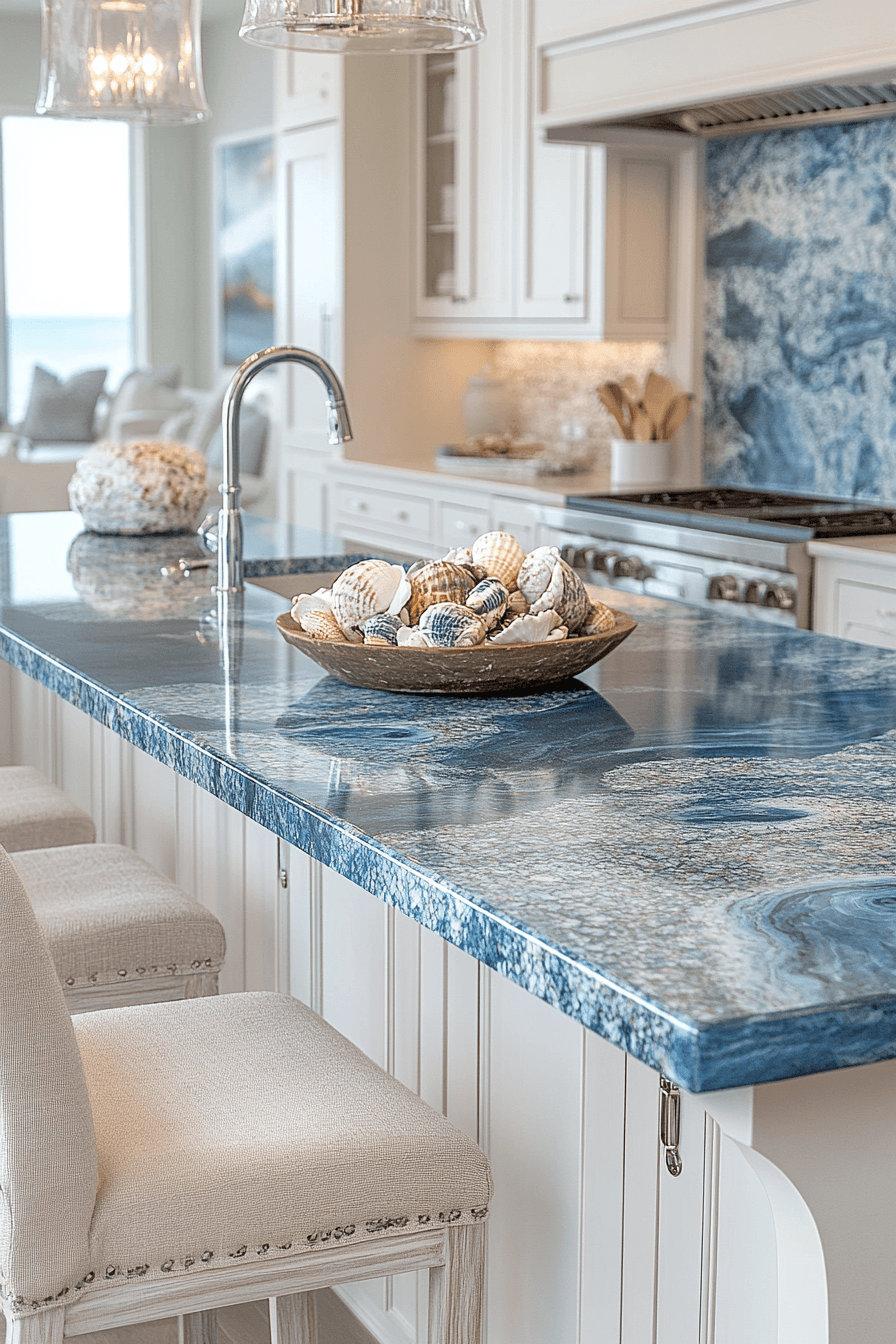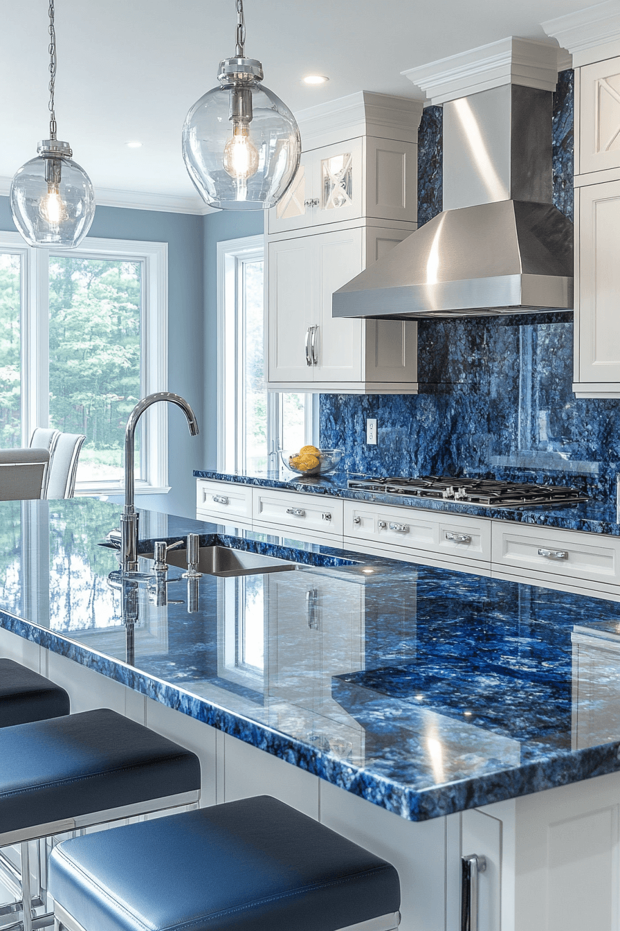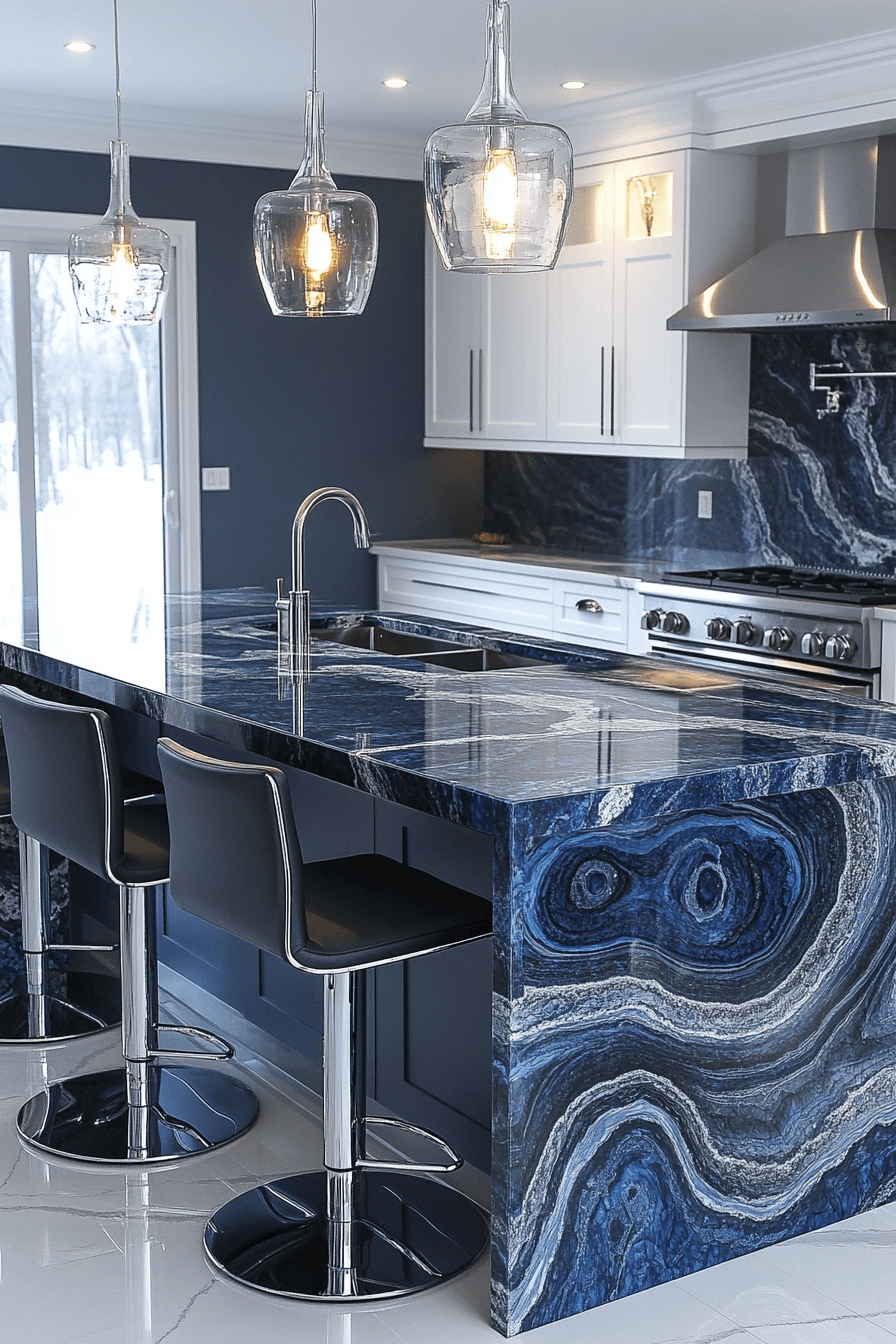 Deep blue tones can transform granite countertops into a bold and elegant centerpiece. Swirls of lighter hues add dimension and create a rich, layered look. Paired with lighter cabinetry or metallic accents, the contrast feels striking and sophisticated. This design brings depth and personality into any room. Granite’s resilience ensures it remains both beautiful and practical over time. Tap to uncover more granite countertops with dramatic, luxurious color.