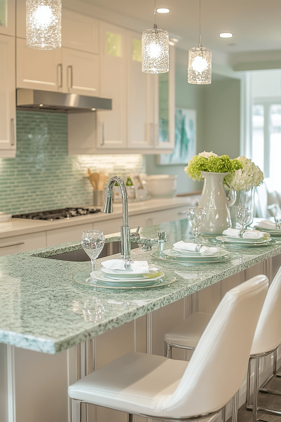 Refreshing mint tones give granite countertops a cool and calming presence that feels unique yet versatile. Light veining adds dimension while keeping the look soft and balanced. This color works beautifully with both wood and white cabinetry for a fresh, modern feel. Granite’s natural durability makes it ideal for busy spaces. The result is a clean, tranquil aesthetic that stands out subtly. Tap to explore more granite countertops with refreshing color palettes.