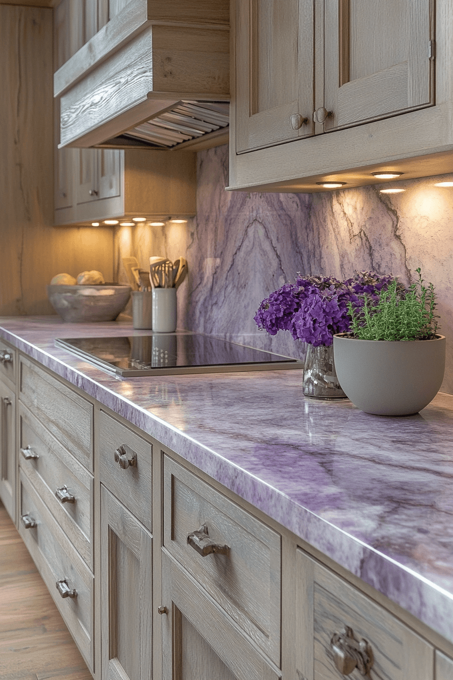 A soft lavender base with intricate veining creates granite countertops that feel both elegant and distinctive. The gentle color adds a unique touch while remaining understated and easy to style. It pairs well with a variety of cabinetry tones, offering flexibility in design. Granite’s strength ensures the surface stays beautiful through everyday use. The overall look feels refined, calm, and quietly luxurious. Click to discover more granite countertops with unique, graceful tones.