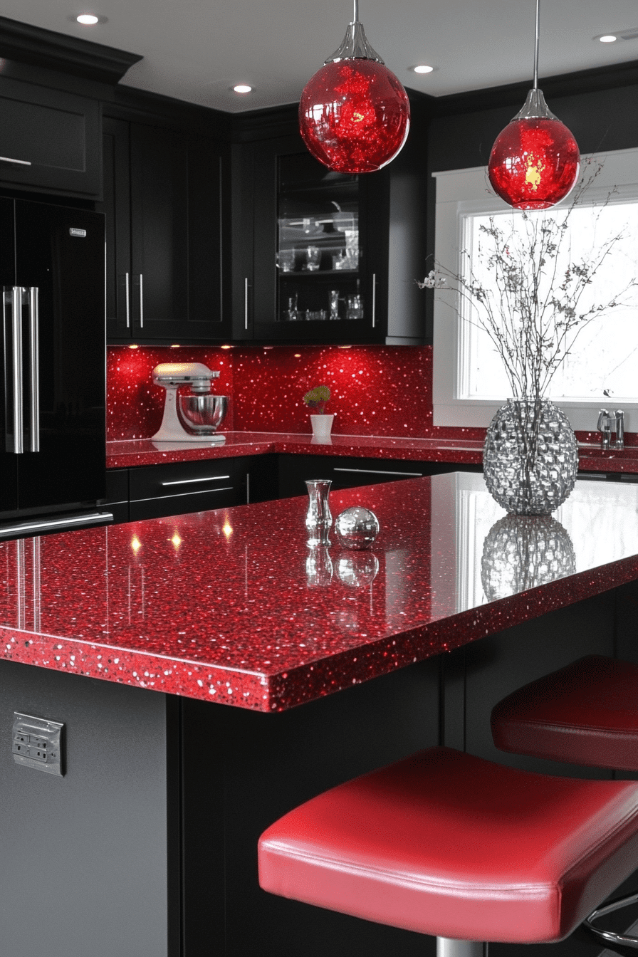 Bold and full of energy, granite countertops with a vibrant red base and speckled accents create a striking focal point in any space. The mix of black and white flecks adds depth while keeping the look balanced. This dramatic color pairs beautifully with neutral cabinetry, allowing the surface to truly stand out. Built for durability, granite ensures long-lasting performance even in busy areas. The result is eye-catching, modern, and full of personality. Tap to explore more granite countertops with bold, statement-making color.
