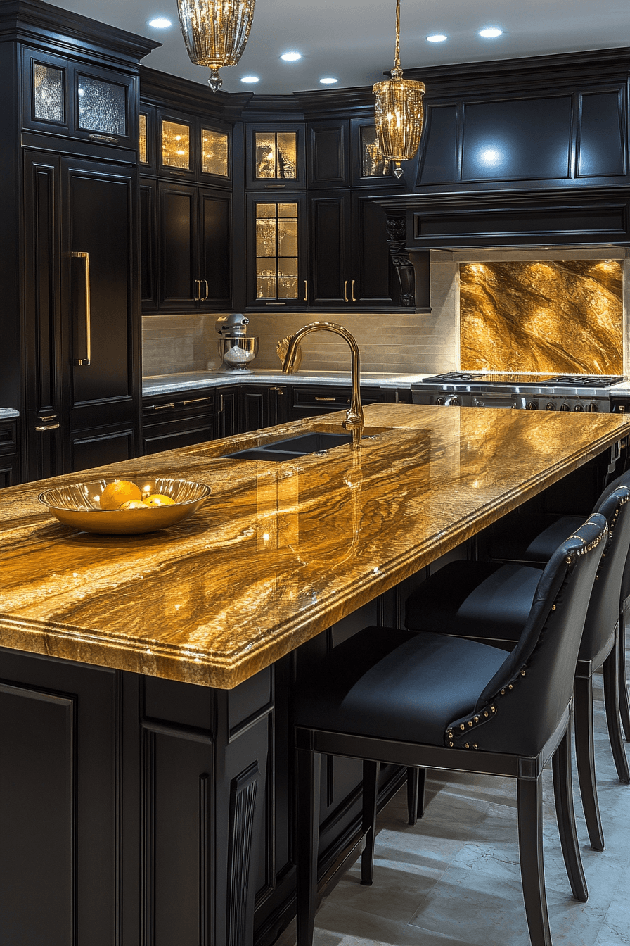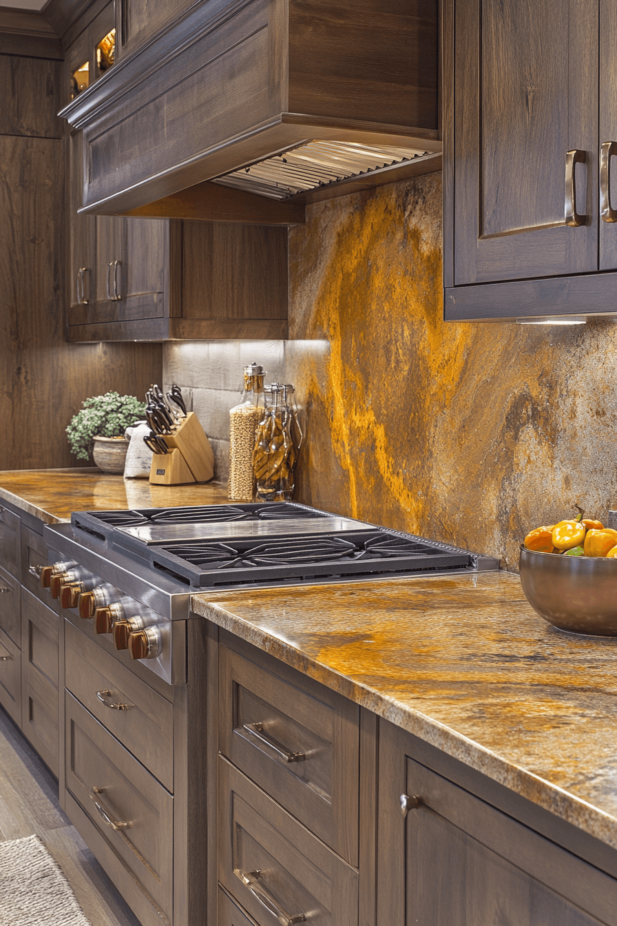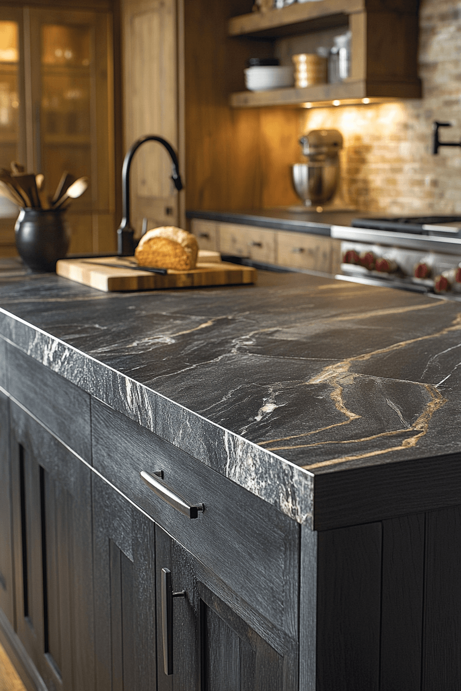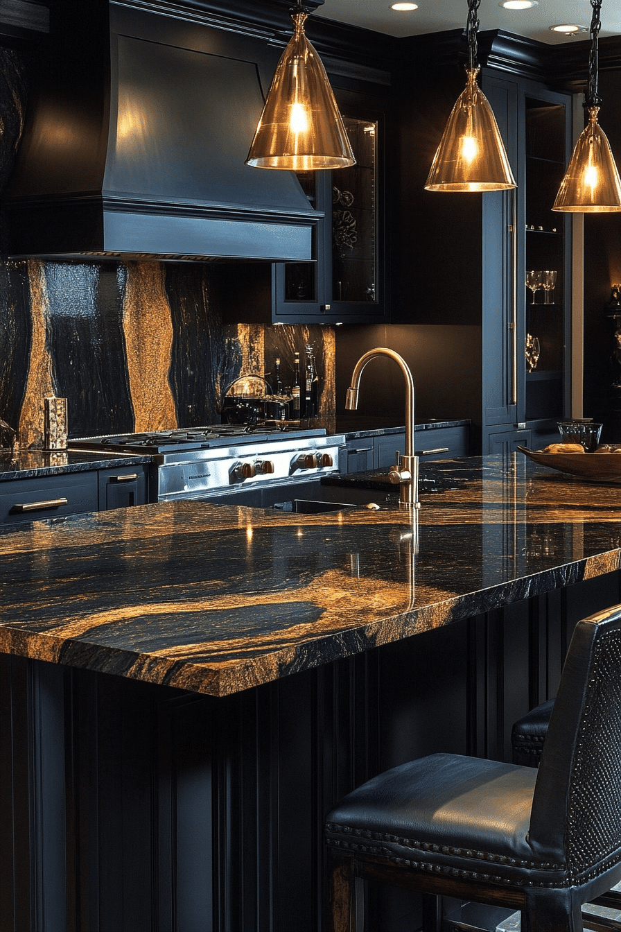 Deep bronze tones combined with rich veining give granite countertops a dramatic and luxurious presence. The interplay of black and gold accents adds depth and sophistication to the design. This bold surface pairs beautifully with darker cabinetry and metallic finishes for a high-end look. Granite’s strength ensures it stands up to daily use while keeping its striking appearance. The overall effect feels powerful, elegant, and timeless. Discover more granite countertops that bring bold luxury into your home.
