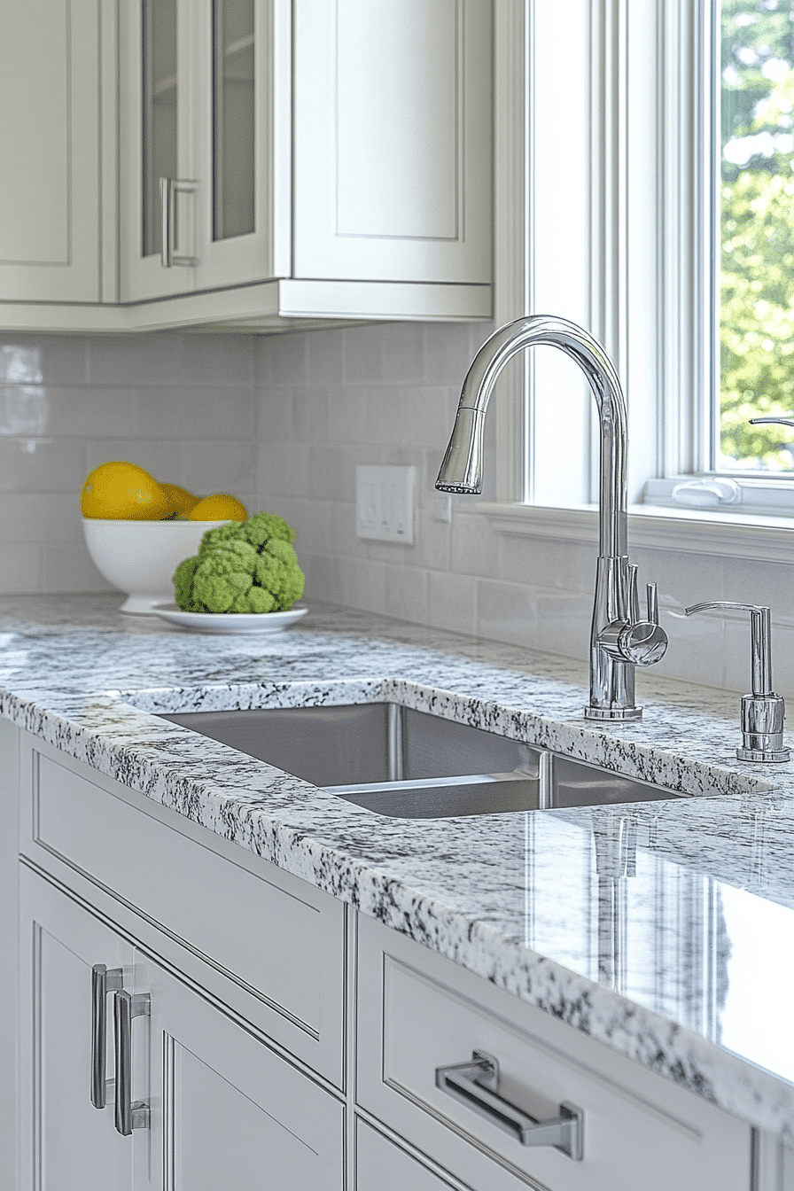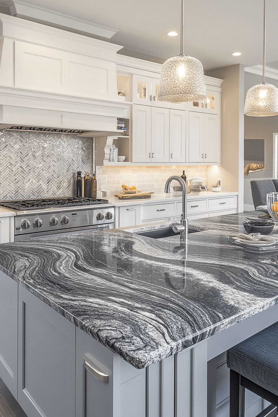 Elegant and luminous, granite countertops with a soft white base and crystal-like veining create a luxurious and polished look. The light-reflecting surface helps brighten the entire room while adding a refined touch. These countertops pair seamlessly with both dark and light cabinetry, making them incredibly versatile. Their strength ensures long-lasting performance with minimal upkeep. It’s a perfect blend of beauty and practicality. Click to explore more granite countertops with a sophisticated finish.